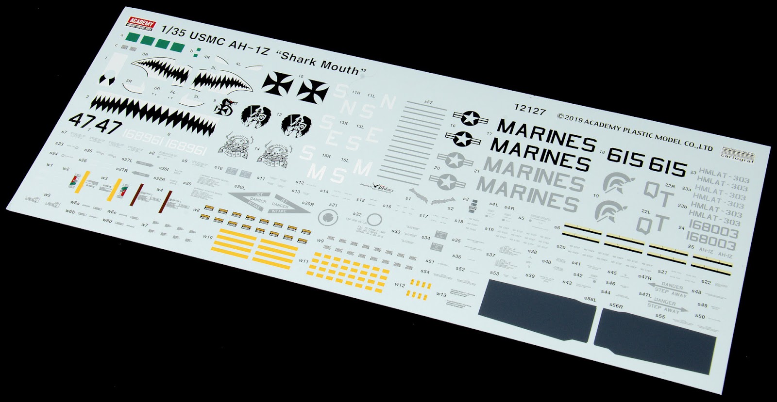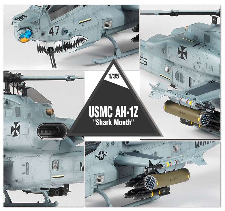 Academy vient de publier une nouvelle trousse d'outils du dernier hélicoptère d'attaque du US Marine Corps, le kit moulé par injection AH-1Z, à l'échelle 1 / 35ème. Cette boxe est appelée "Shark Mouth" car 3 des 4 marques ont des dents grimaçantes sur le nez de l'hélicoptère, ce qui lui donne un aspect menaçant. Dans la boite du kit, on nous promet :