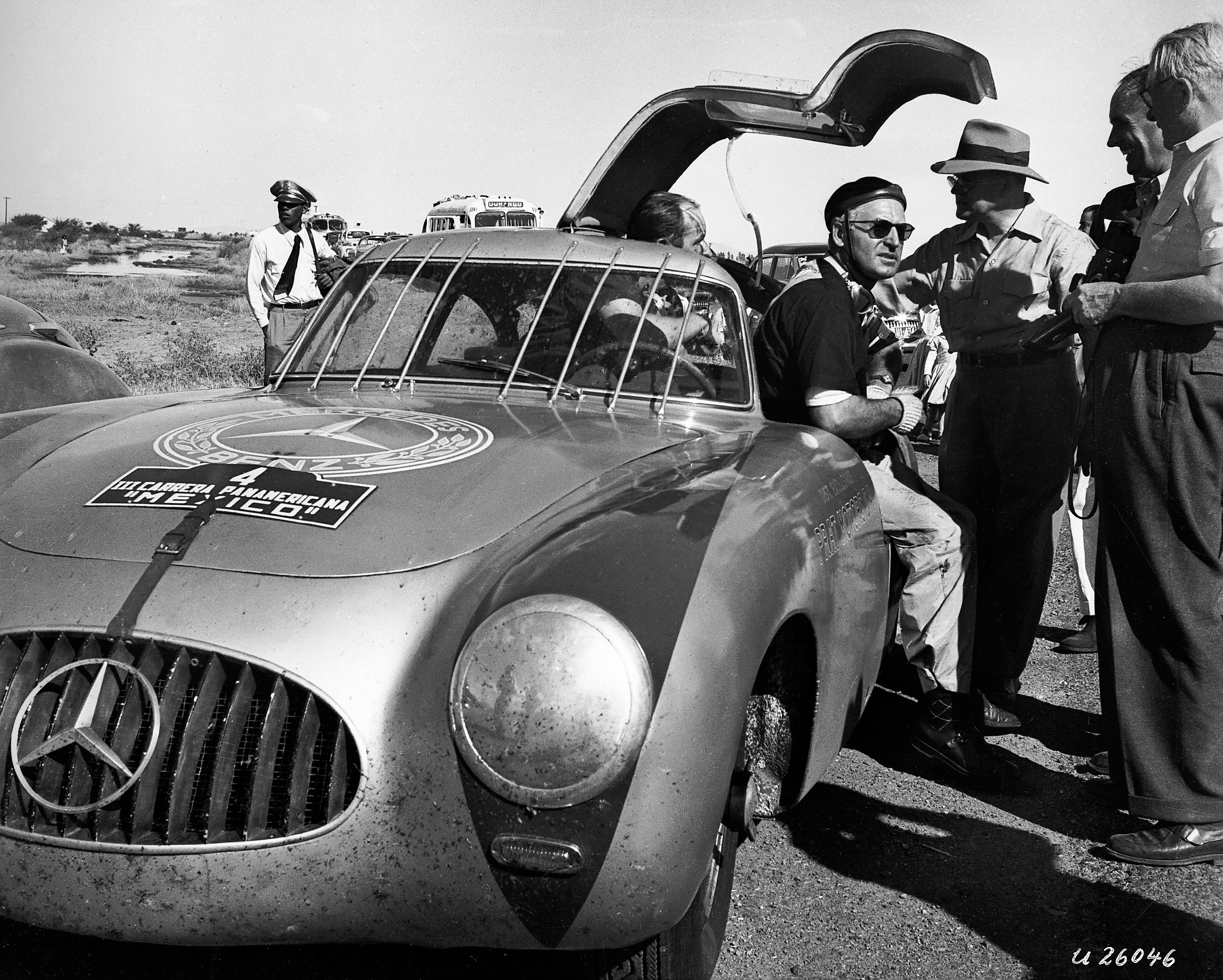 Au début des années 1950, Mercedes décida de revenir dans le sport automobile international, et Alfred Neubauer se vit à nouveau confier cette tâche. En 1951, la société a construit 5 voitures V8 W165 et des moteurs pour participer au Grand Prix. Le V12 de Ferrari s’est cependant bien comporté à Silverstone, et Neubauer savait que la W165 ne pouvait pas gagner ; Mercedes a commencé à planifier un V12 W195. La commission sportive de la FIA a changé les règles pour 1954 en octobre 1951, et les W195 ne pouvaient pas concourir. La société a commencé à développer une 300 SL à 6 cylindres pour la course. Ses portes s’étendaient à l’origine sur le bas des vitres latérales, et l’accès par celles-ci nécessitait un volant amovible.