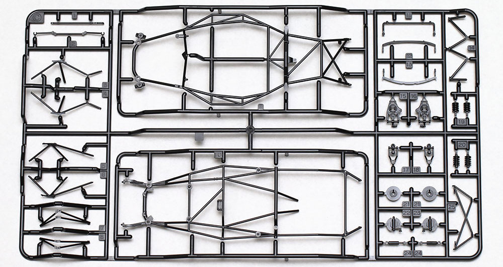 La construction du châssis complexe à cadre spatial est réalisée avec 12 pièces parfaitement conçues, parfaitement ajustées et positionnées positivement. J’ai utilisé de la colle (cement) extra-fine à prise rapide pour fixer les pièces et j’ai pulvérisé l’ensemble avec du Tamiya Gloss Black (no TS-14). Les pièces de suspension arrière et avant ont été peintes et ajoutées, conformément aux instructions, tout s’installant sans accroc.