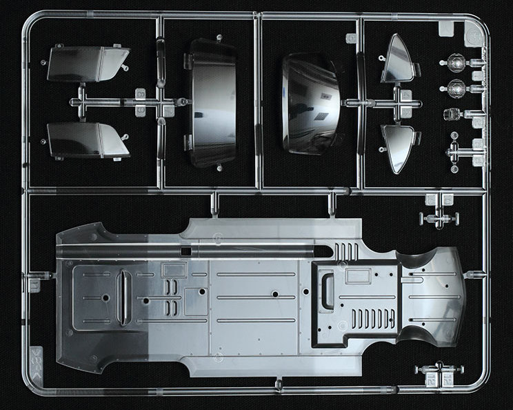 Le châssis, le moteur et les pièces intérieures sont moulés en noir ou gris argenté avec un cadre composé de pièces chromées brillantes pour les pare-chocs, la calandre, etc. Une petite feuille de décalcomanies couvre les jauges du tableau de bord, quelques panneaux moteur et plaques d’immatriculation. La fiche d’instructions clairement illustrée inclut des indices de peinture pour l’acrylique et la peinture en aérosol Tamiya, mais pas la gamme LP, avec ses 24 étapes d’assemblage.