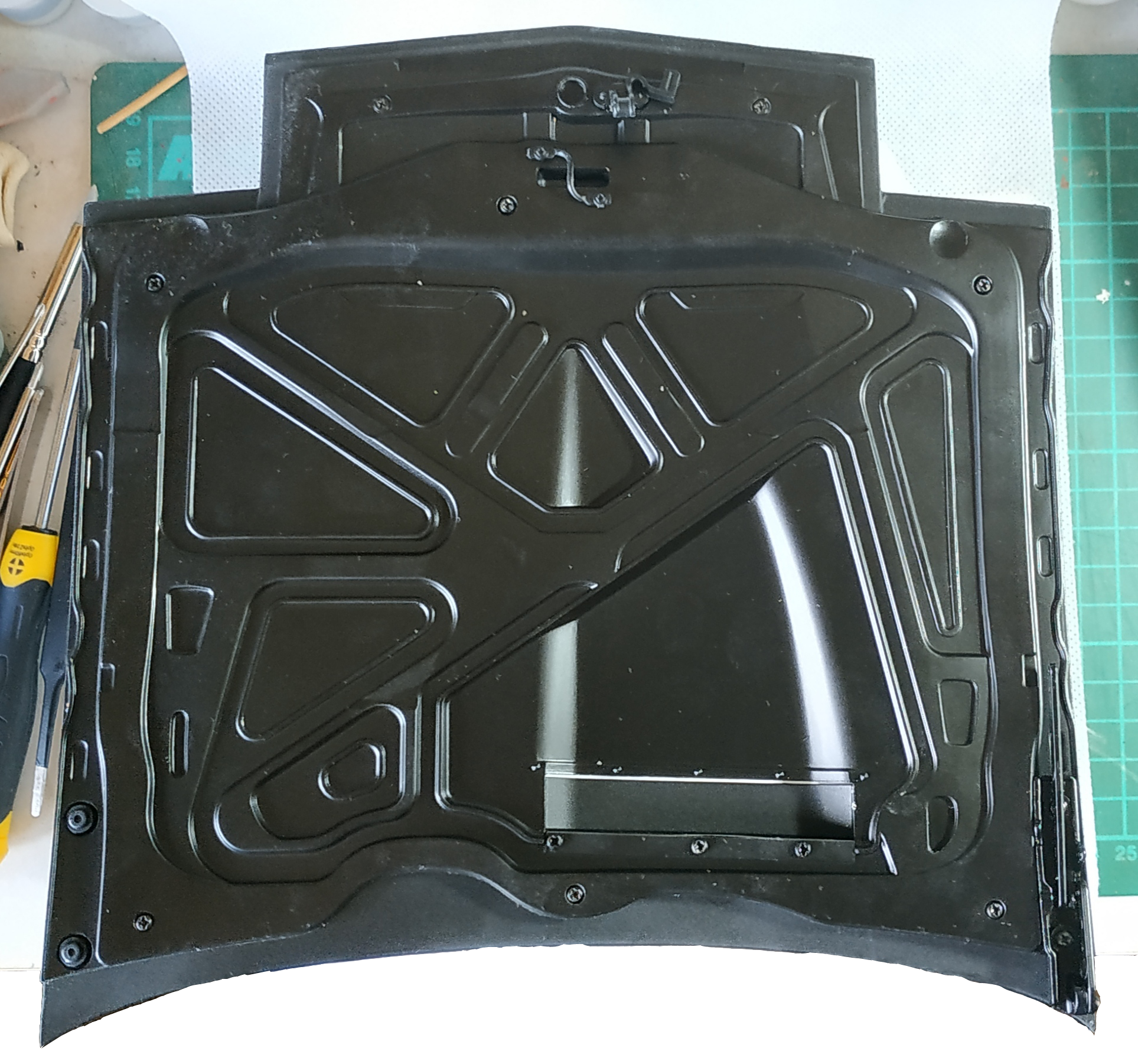 Le numéro 1 inclue les éléments pour l'assemblage du capot : capot avant, renfort intérieur du capot, crochet de verrouillage du capot, prise d'air, grille de prise d'air, des charnières, la platine de charnière du capot, le verrou de capot, et un tournevis.