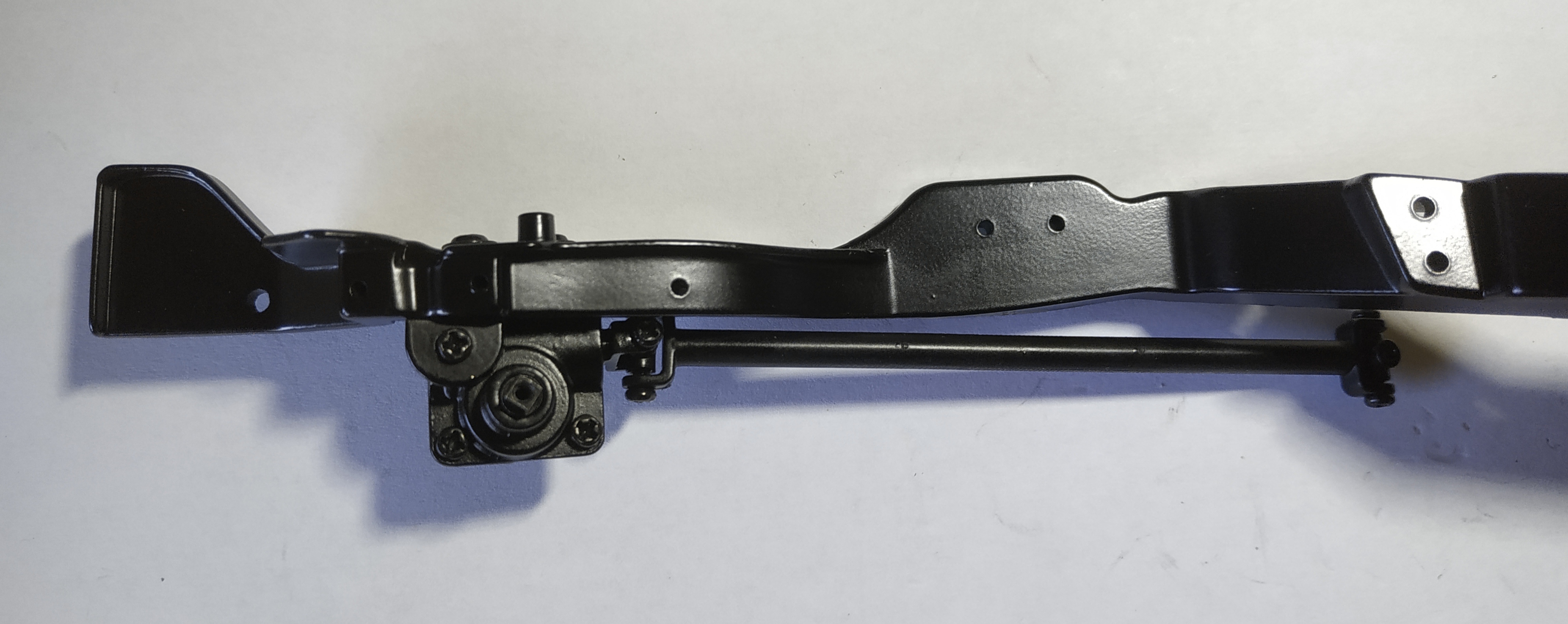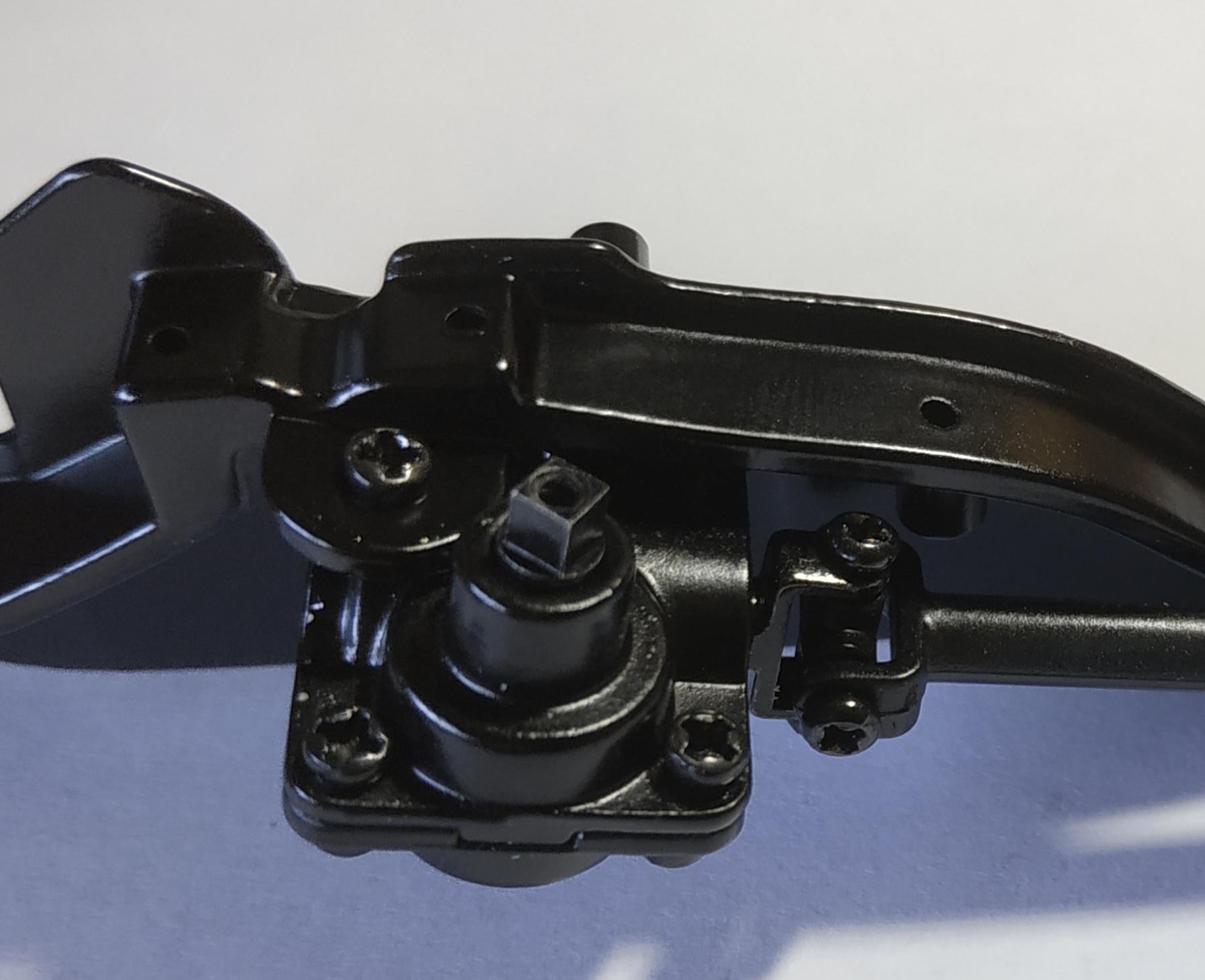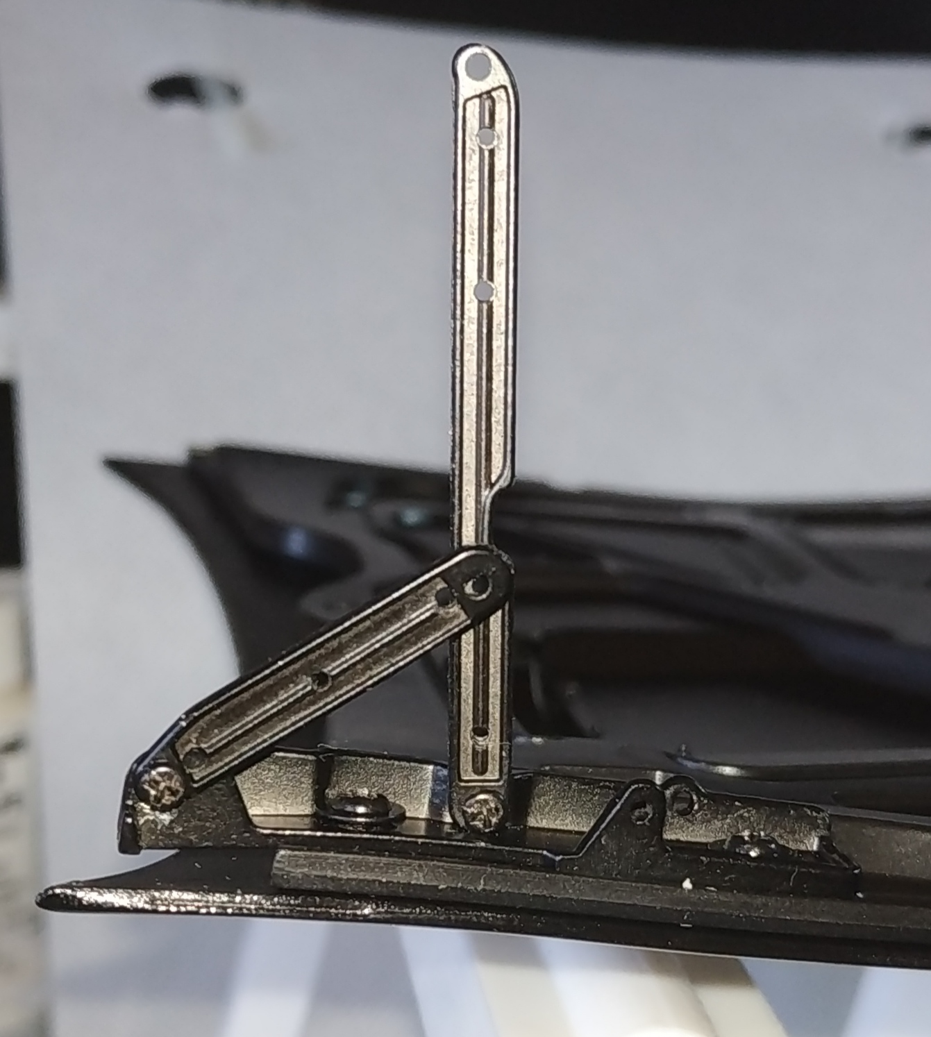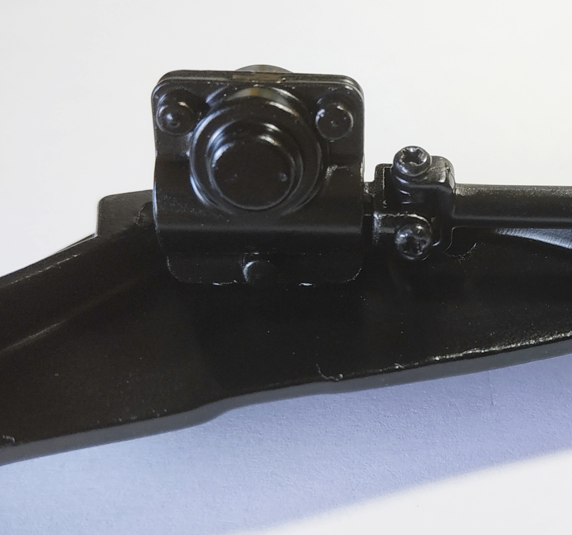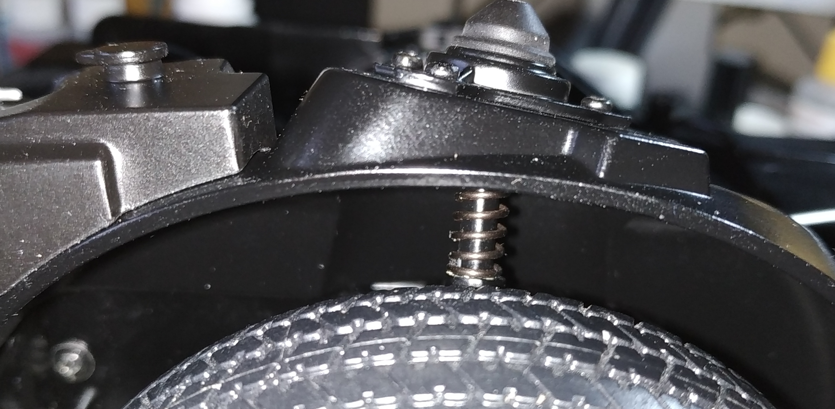 La photo suivante représente l'étape 4 du numéro 8. J'ai eu énormément de mal à visser. La vis doit entrer par un trou, chopper celui de la pièce supérieure pour la maintenir, enfin passer par le trou de sortie. Il faut faire cette action en maintenant la pièce supérieure et en compressant le ressort de suspension. Vous voyez ma grande difficulté en observant la tête de la vis et le fait qu'elle ne soit pas entrer entièrement. Je pense que je n'ai pas trouvé le trou de sortie.