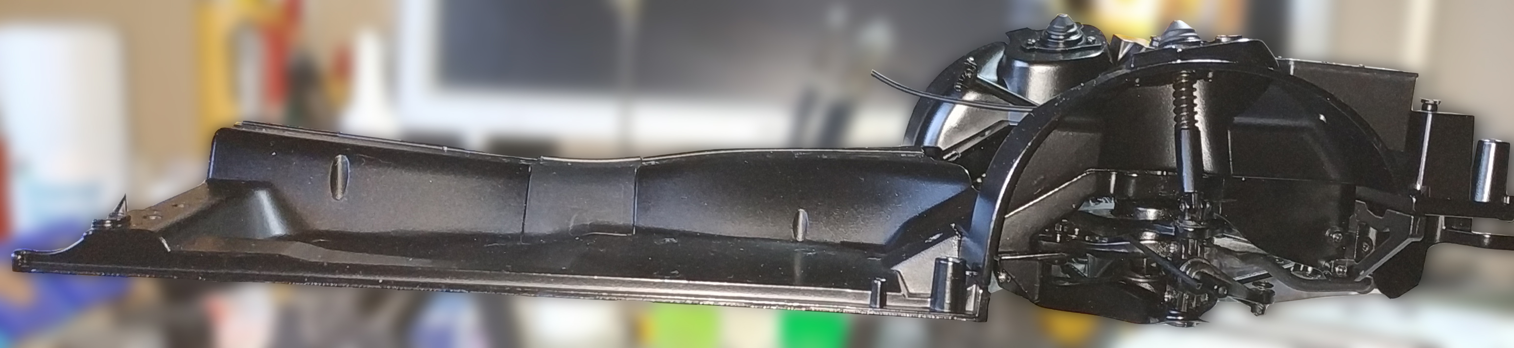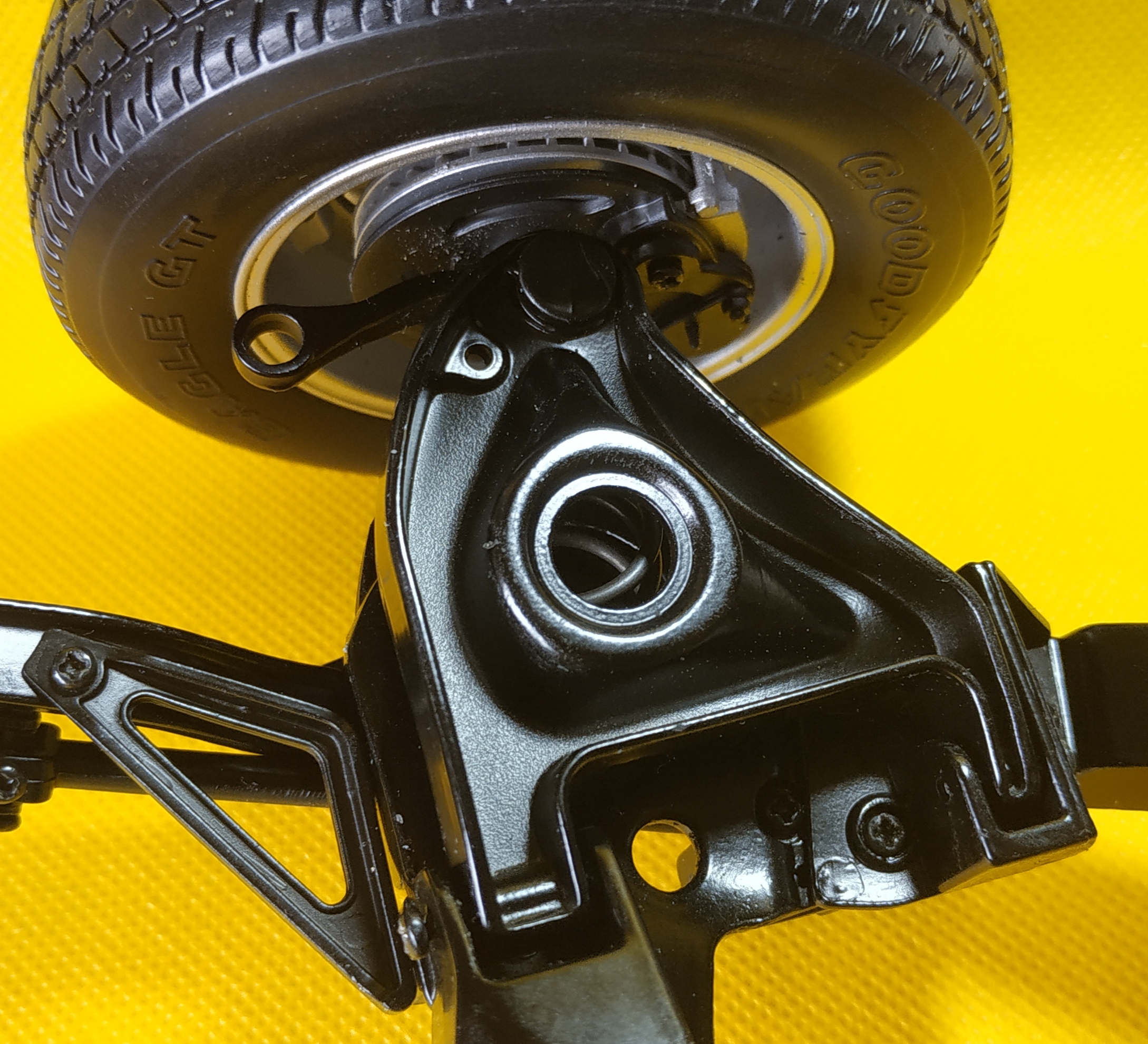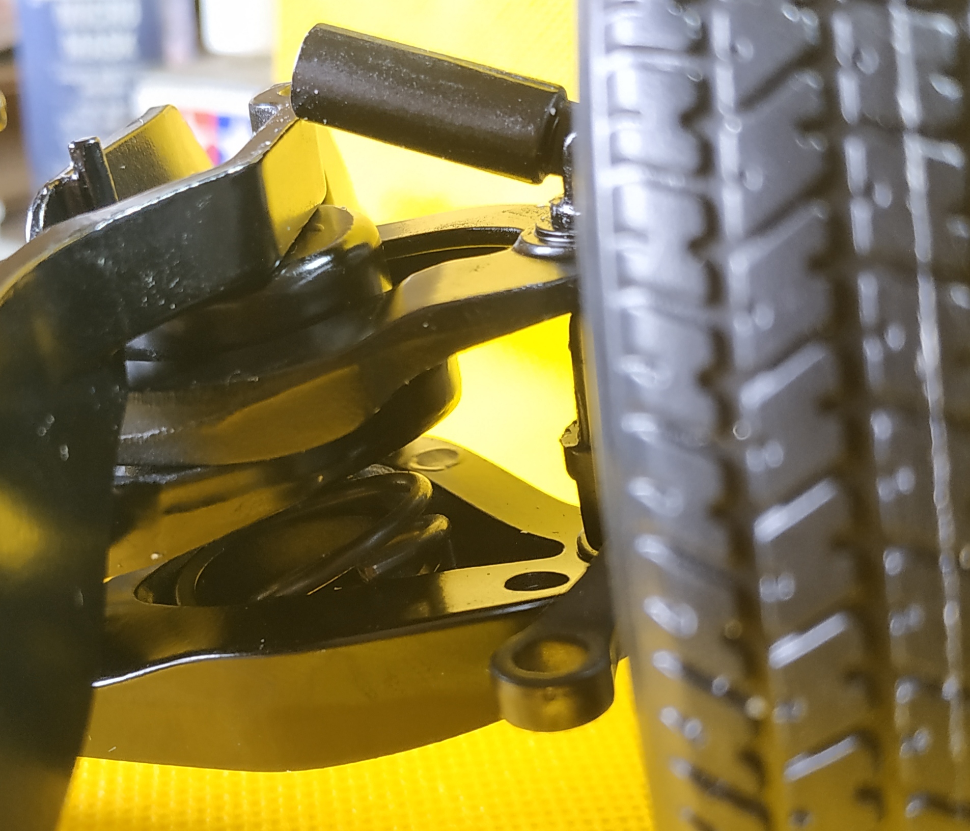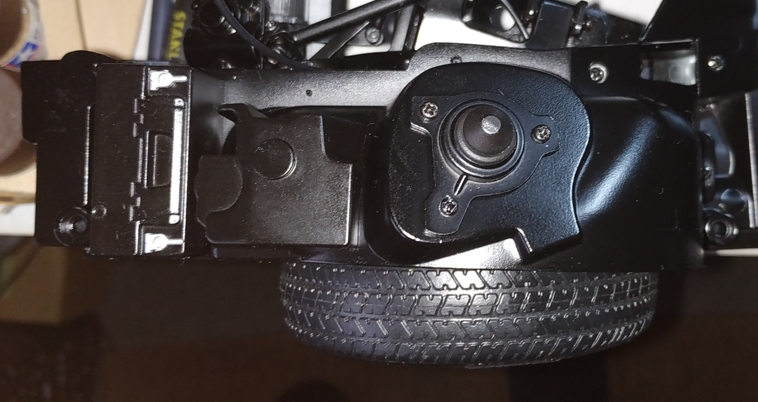 La photo suivante représente l'étape 4 du numéro 8. J'ai eu énormément de mal à visser. La vis doit entrer par un trou, chopper celui de la pièce supérieure pour la maintenir, enfin passer par le trou de sortie. Il faut faire cette action en maintenant la pièce supérieure et en compressant le ressort de suspension. Vous voyez ma grande difficulté en observant la tête de la vis et le fait qu'elle ne soit pas entrer entièrement. Je pense que je n'ai pas trouvé le trou de sortie.