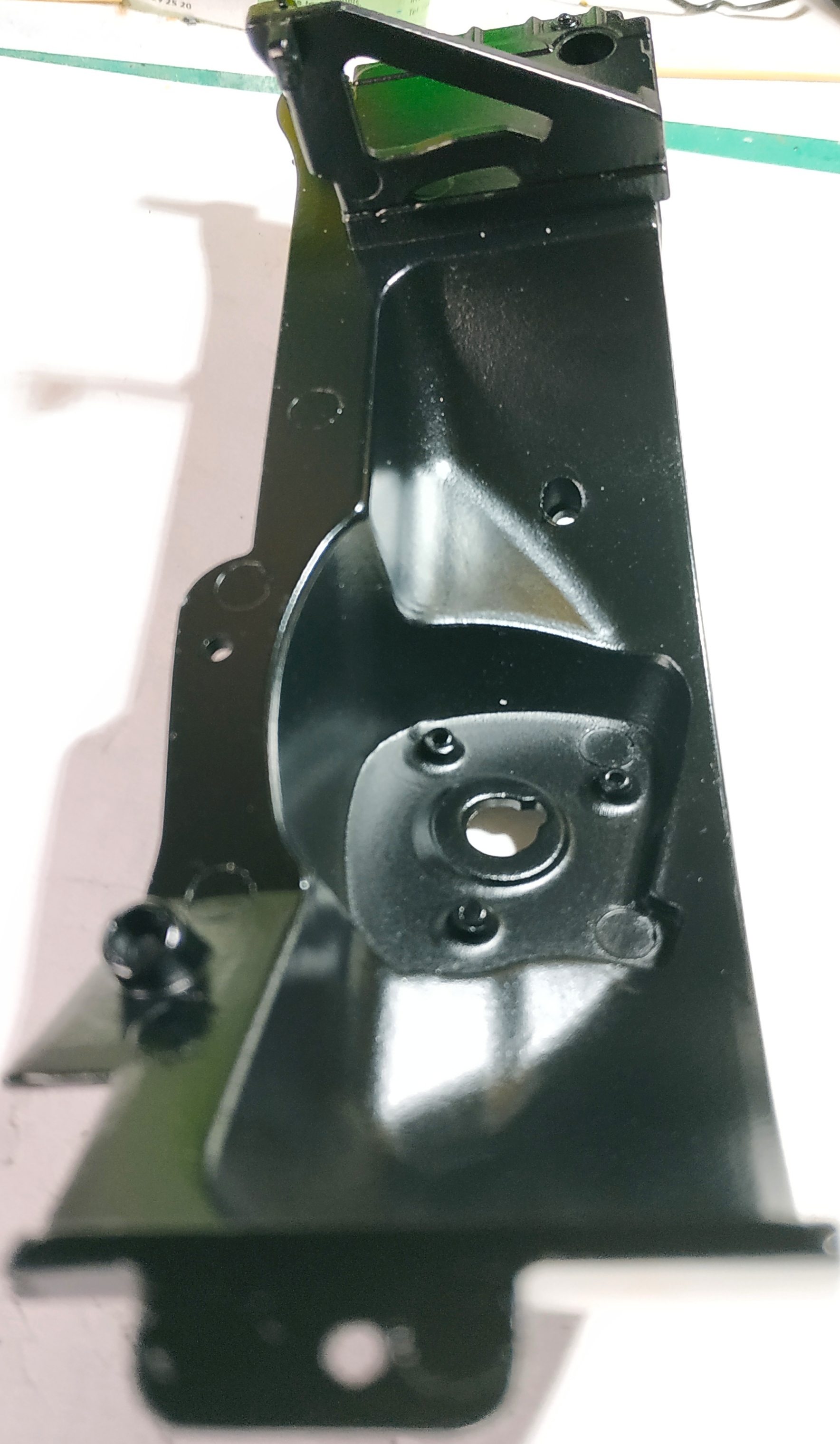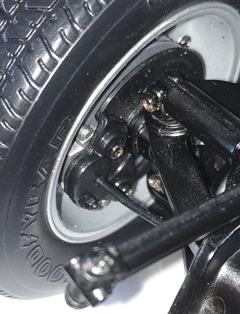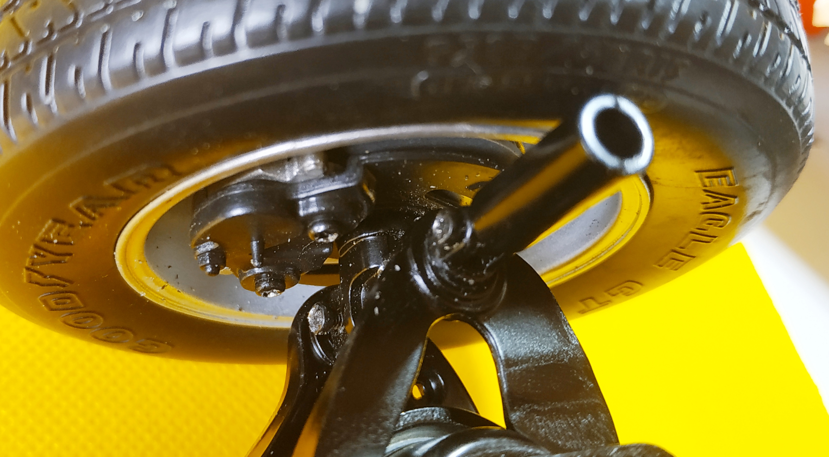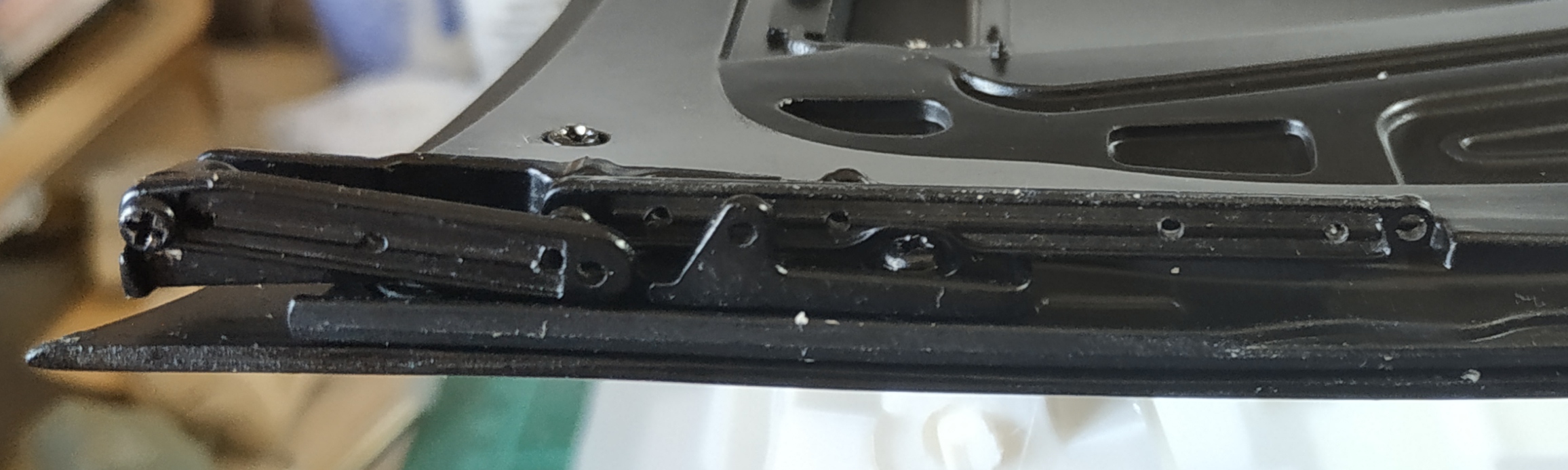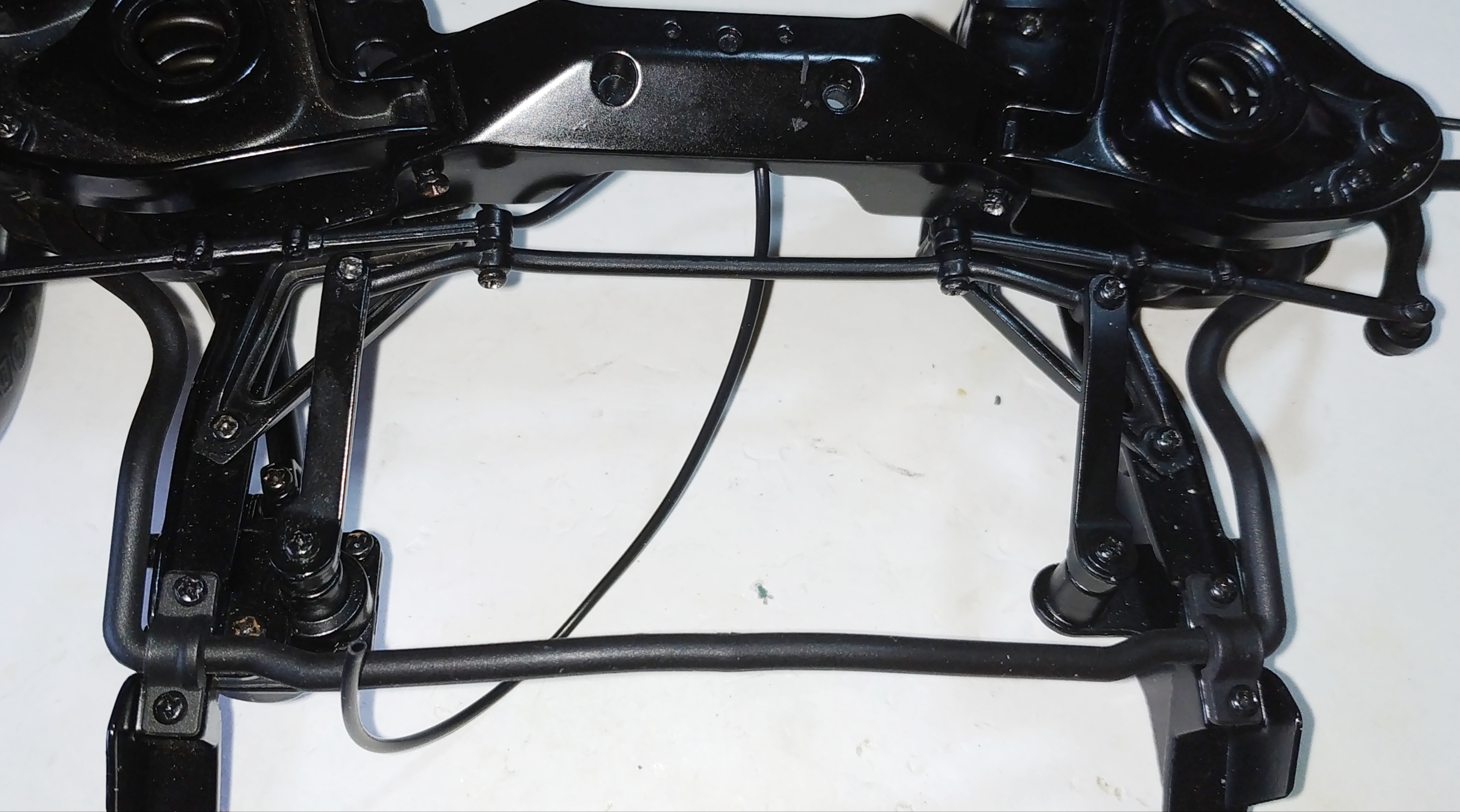 La photo suivante représente l'étape 4 du numéro 8. J'ai eu énormément de mal à visser. La vis doit entrer par un trou, chopper celui de la pièce supérieure pour la maintenir, enfin passer par le trou de sortie. Il faut faire cette action en maintenant la pièce supérieure et en compressant le ressort de suspension. Vous voyez ma grande difficulté en observant la tête de la vis et le fait qu'elle ne soit pas entrer entièrement. Je pense que je n'ai pas trouvé le trou de sortie.