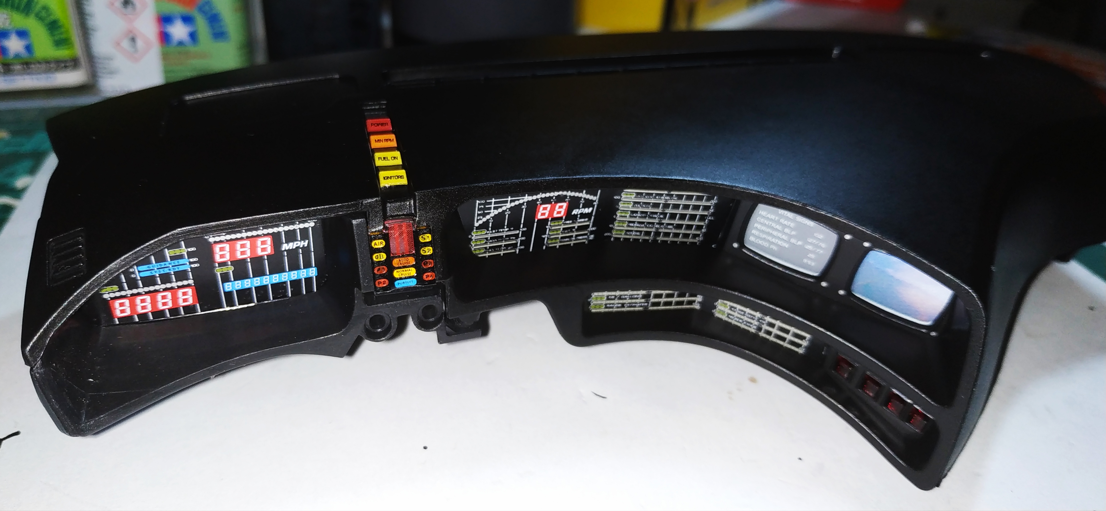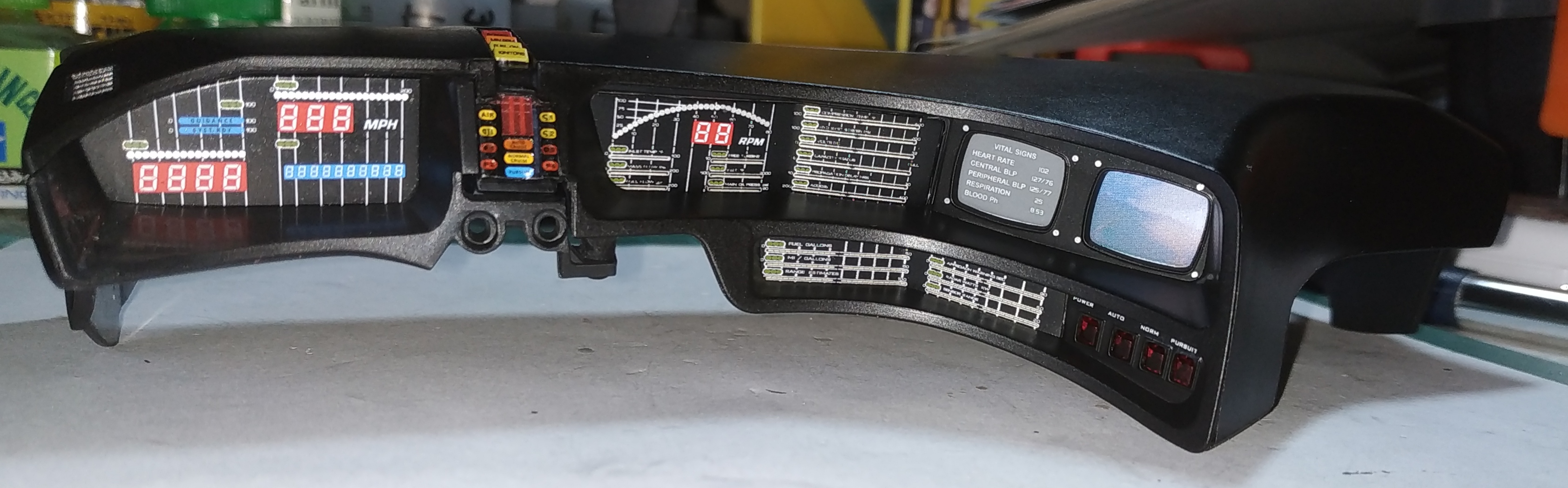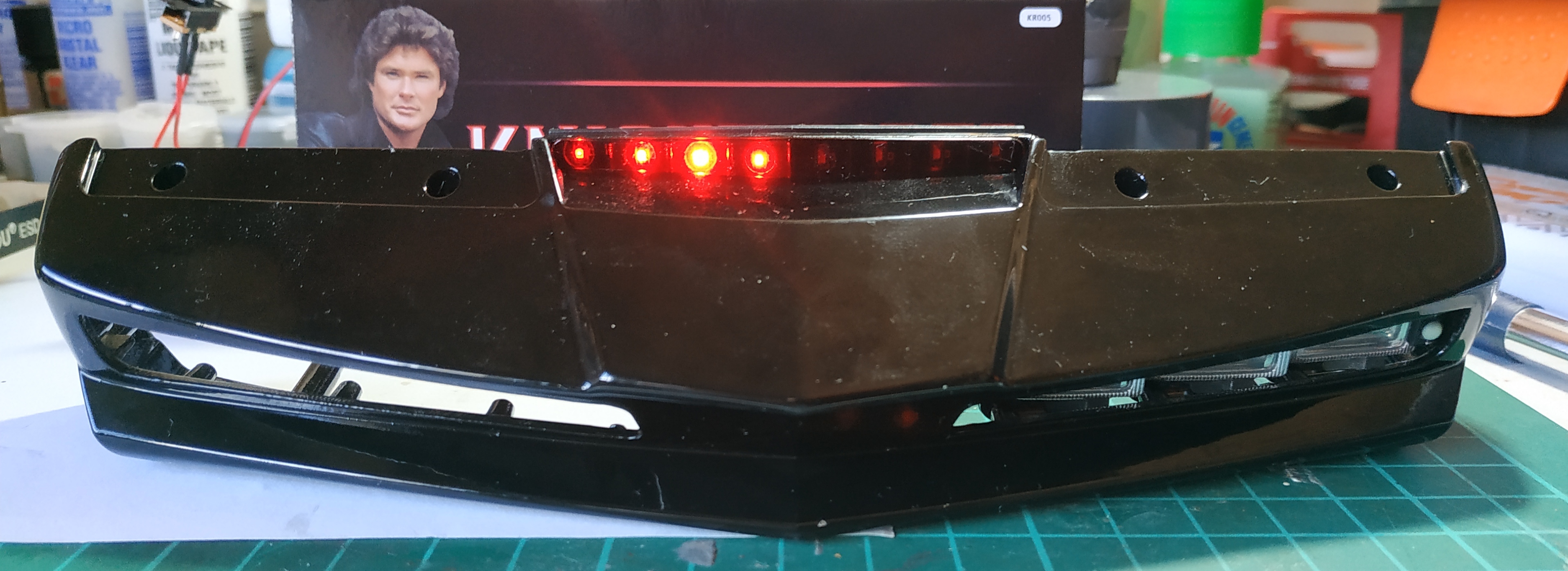 Le numéro 4 inclue les éléments pour l'assemblage du tableau de bord : tableau de bord, panneau gauche du tableau de bord, boîtier inférieur droit du tableau de bord, boîtiers d'instrumentation gauche et droite, boîtier du synthétiseur vocal de K.I.T.T, support de commande de démarrage, tableau de bord (inférieur droit), écrans de contrôle, tableau de bord droit, tableau de bord gauche, face avant du synthétiseur vocal de K.I.T.T, commande de démarrage, panneau de commandes inférieur droit, boîtier du panneau de commandes inférieur droit, colonne de direction, volant, emblème de la Knight Foundation, supports des commandes du volant, commandes au volant gauche et droit.