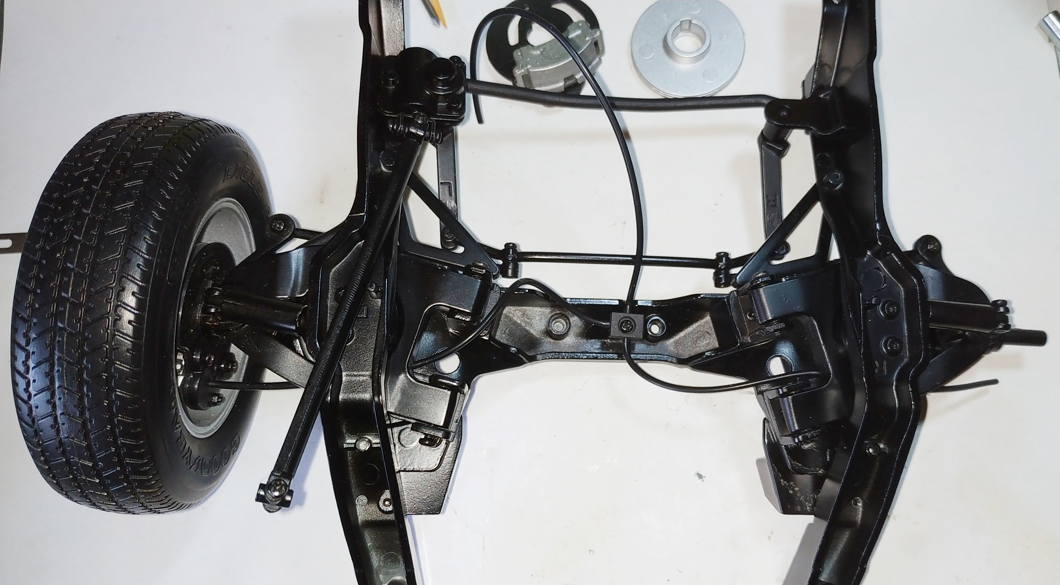 Le numéro 7 inclue les éléments pour le montage de la suspension avant (2) et du boîtier de direction : longeron de châssis avant gauche, colonne de direction, couvercle du boîtier de direction, boîtier de direction, joints de direction, arbre à vis sans fin, pignon de direction, bras de commande supérieur de la suspension avant gauche.