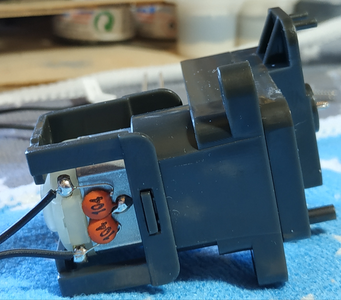 Petit problème d'explication dans la notice pour la position des LED. Il est expliqué : "Faites soigneusement passer le câblage entre les 2 bords de la coque du cockpit" mais si vous faites ceci comme ça, ça ne fonctionne pas, les câbles étant trop courts. Il faut d'abord plié soigneusement les pattes des LED pour avoir assez de jeu. On voit sur la photo de la notice que les pattes sont pliées mais ce n'est pas expliqué.