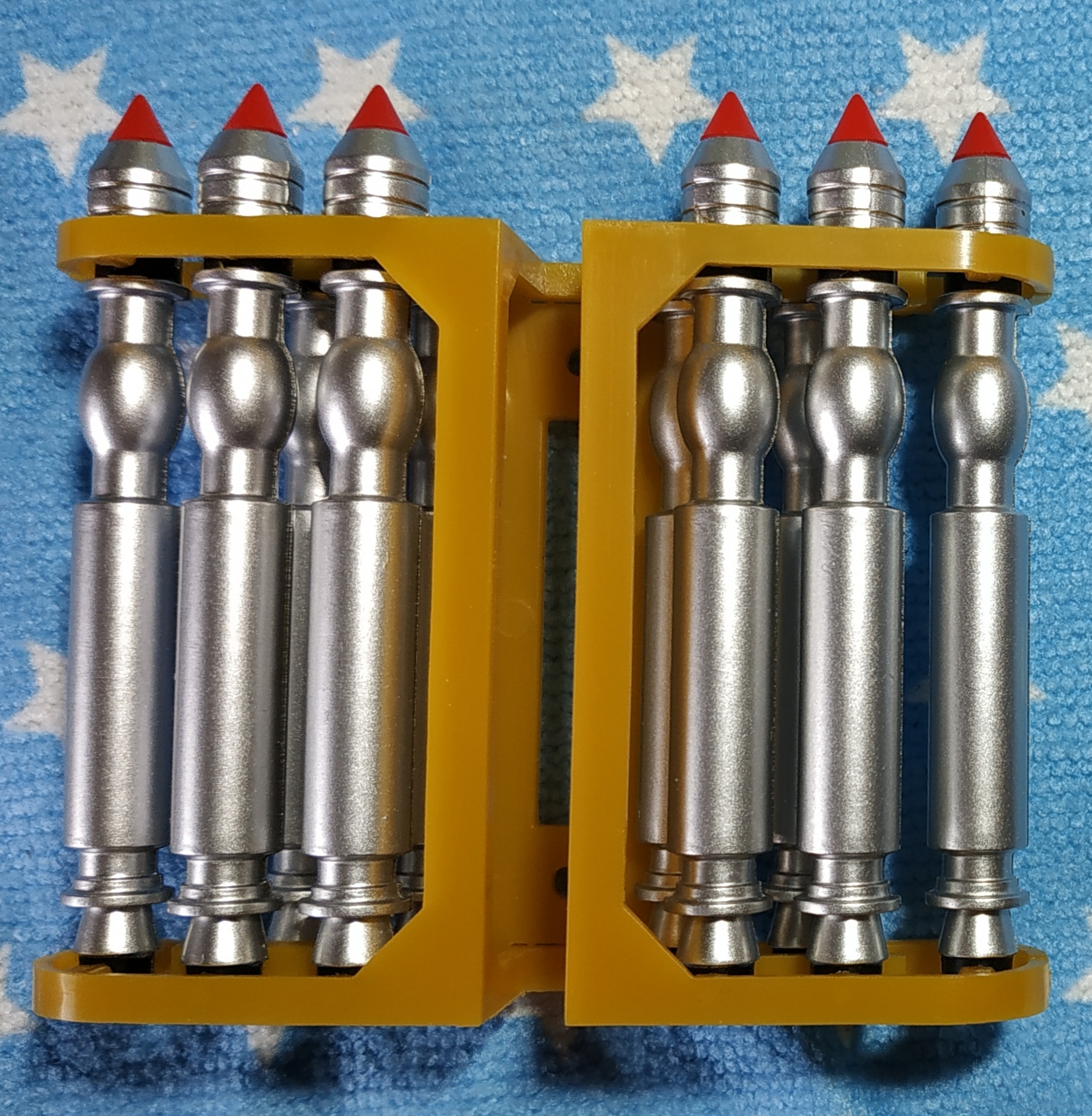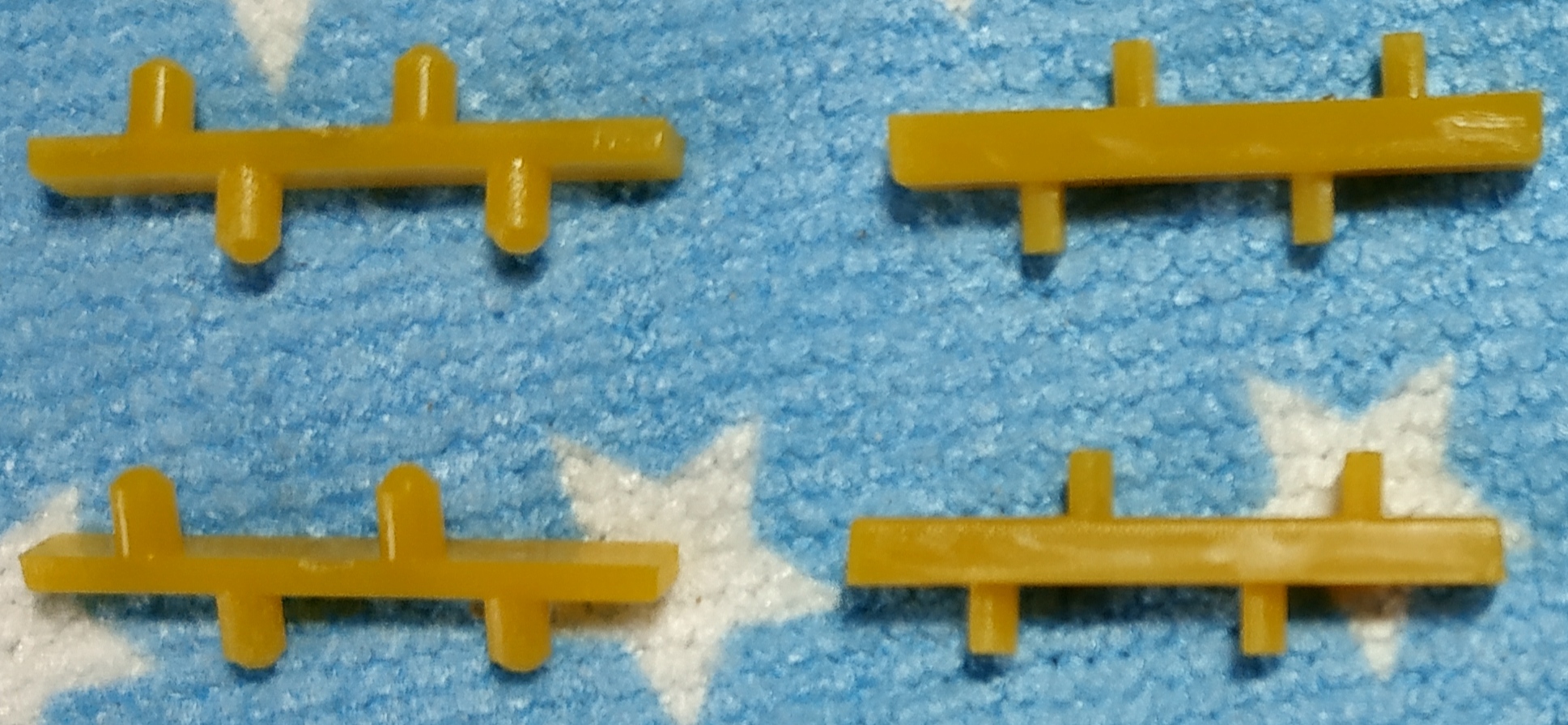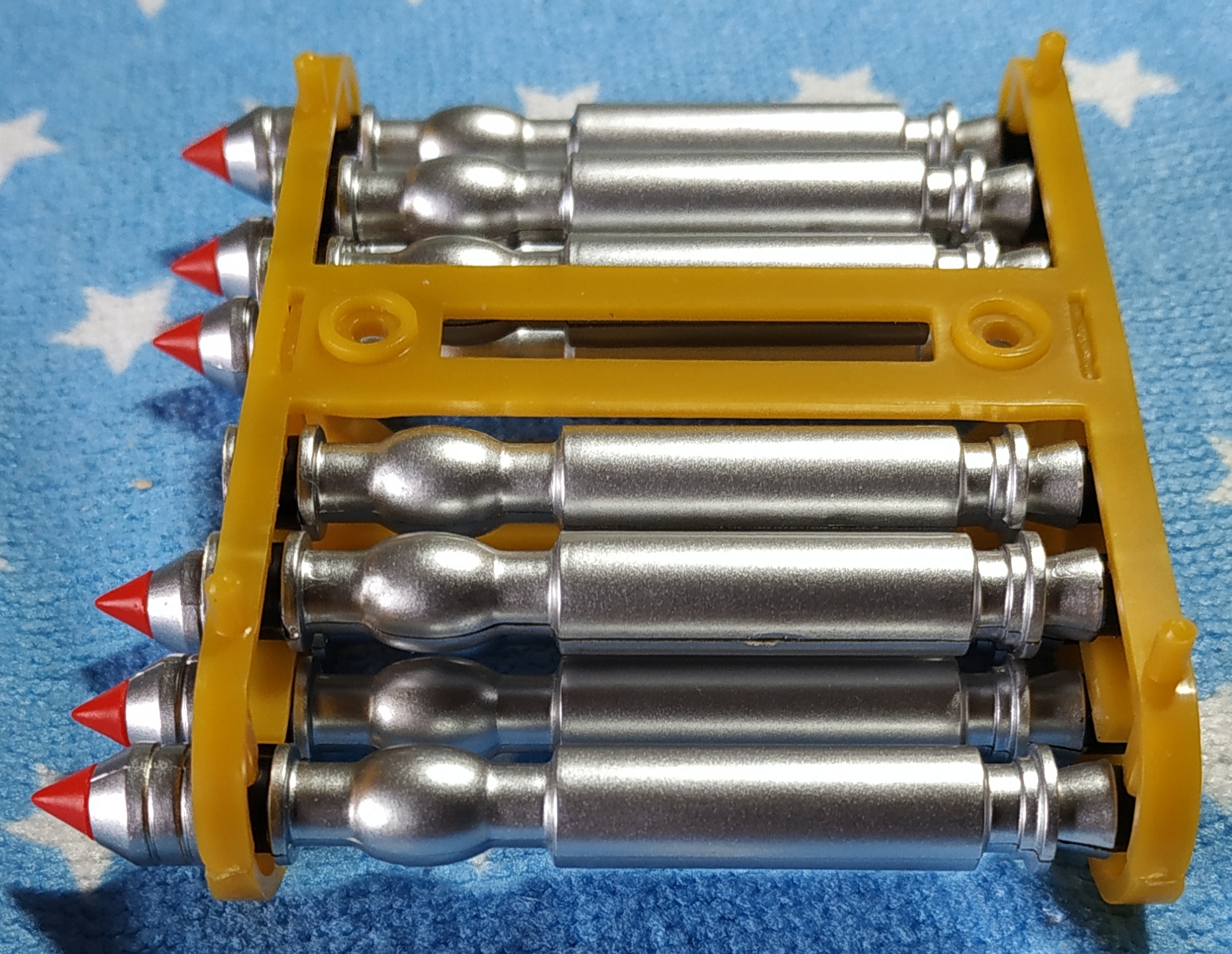 On voit bien qu'il y a des cales épaisses et des cales fines. Les cales fines ont des picots ronds et sont à monter sur la tête des torpilles ; les cales épaisses ont des picots en demi-lune (en forme de D) et sont à installer en bas des torpilles. Ne forcez pas si les picots ne s'enfoncent pas correctement, ils sont sûrement du mauvais côté.