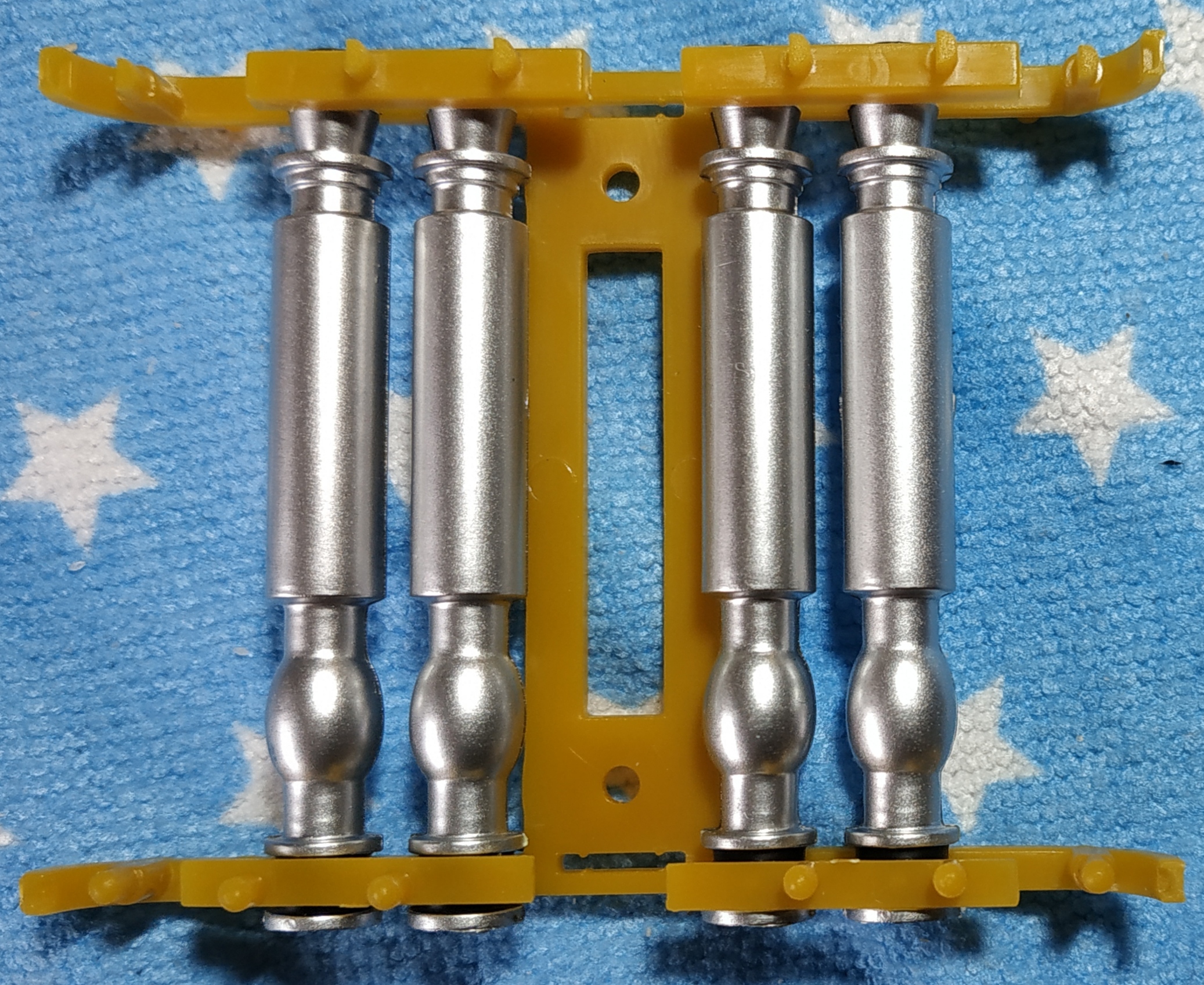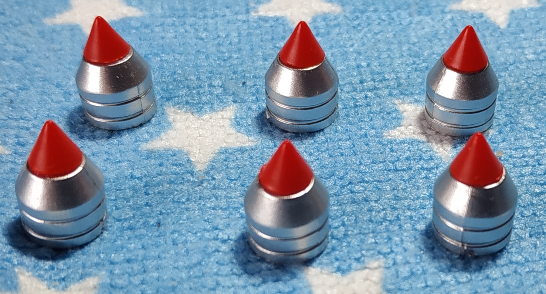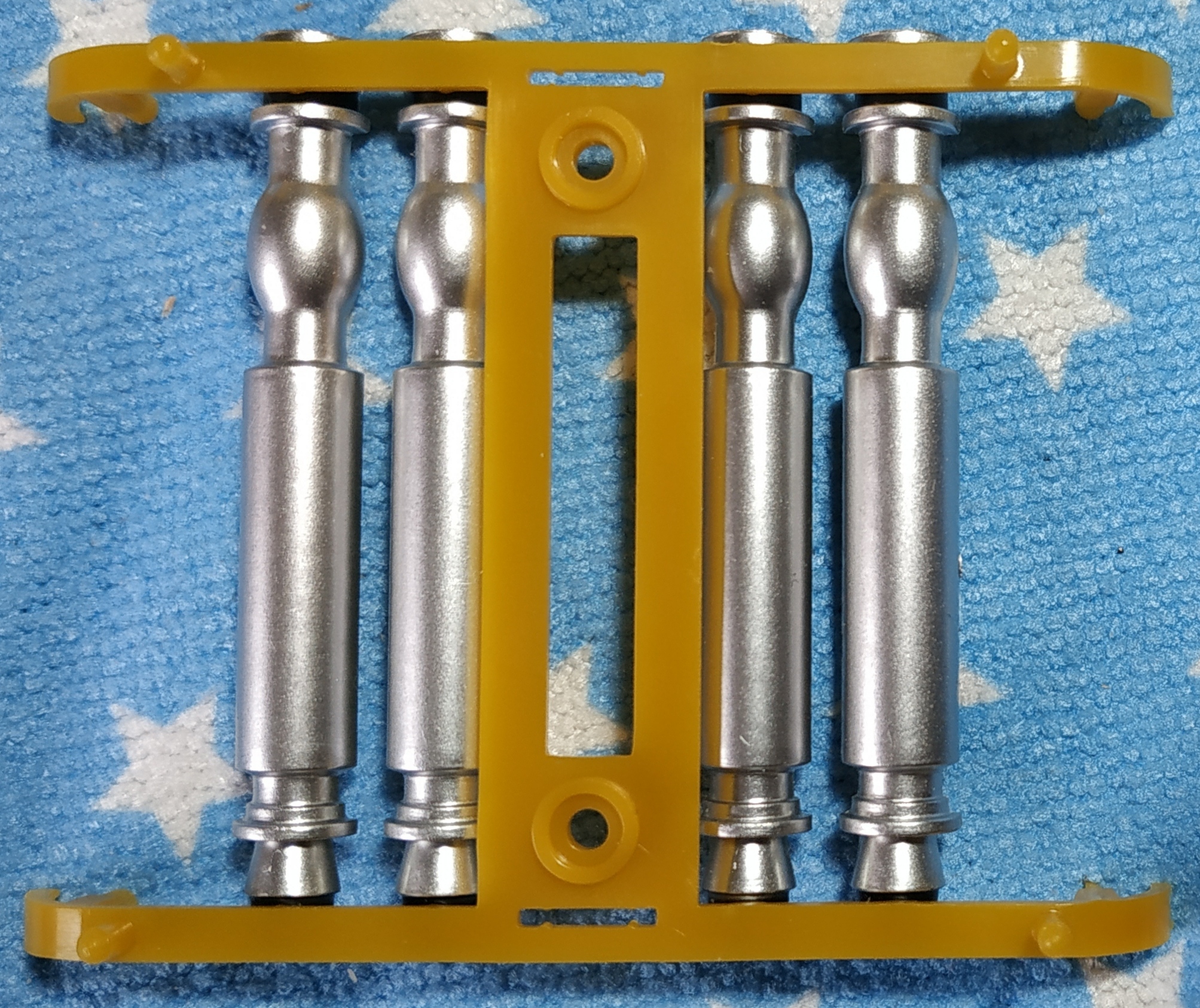 On voit bien qu'il y a des cales épaisses et des cales fines. Les cales fines ont des picots ronds et sont à monter sur la tête des torpilles ; les cales épaisses ont des picots en demi-lune (en forme de D) et sont à installer en bas des torpilles. Ne forcez pas si les picots ne s'enfoncent pas correctement, ils sont sûrement du mauvais côté.