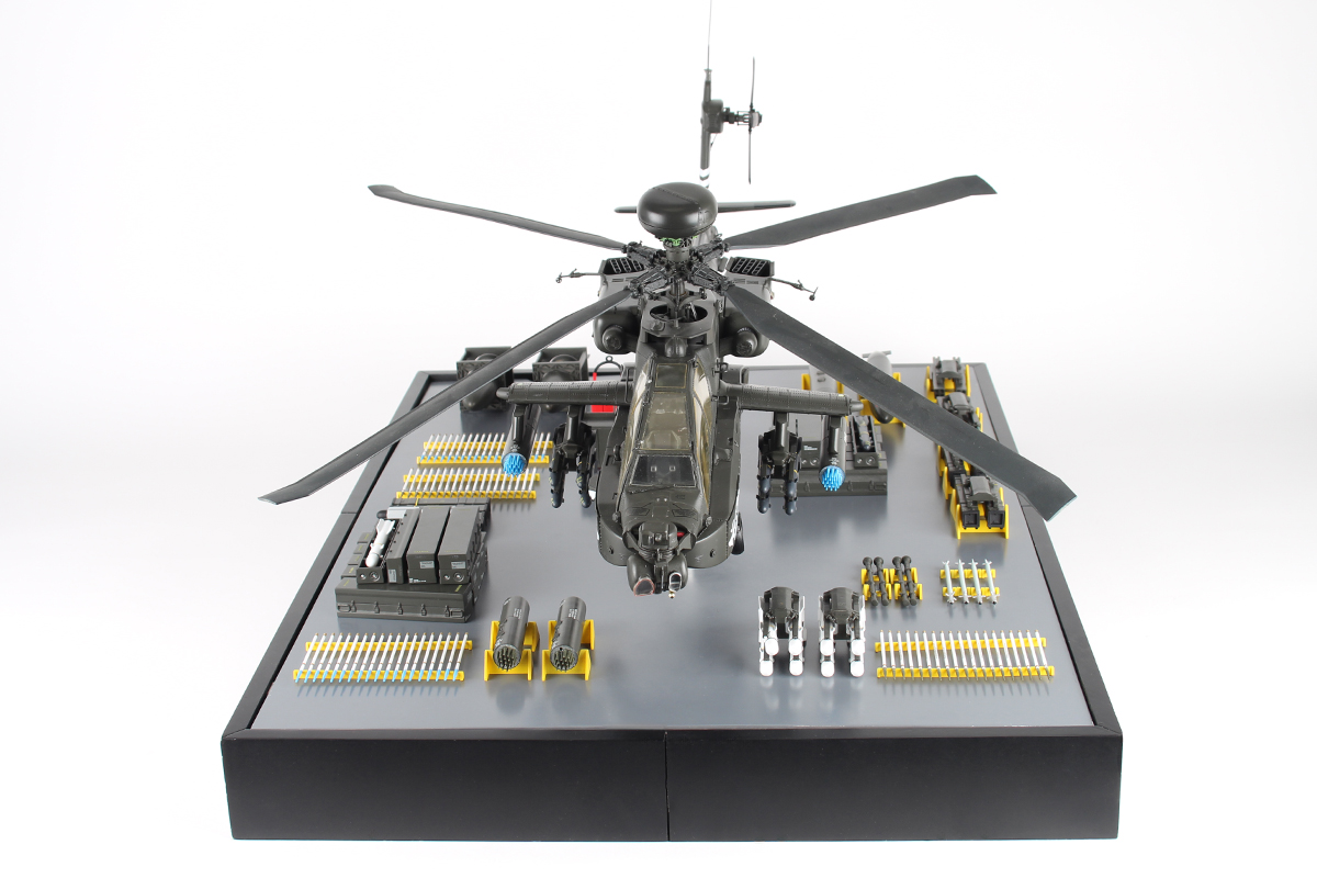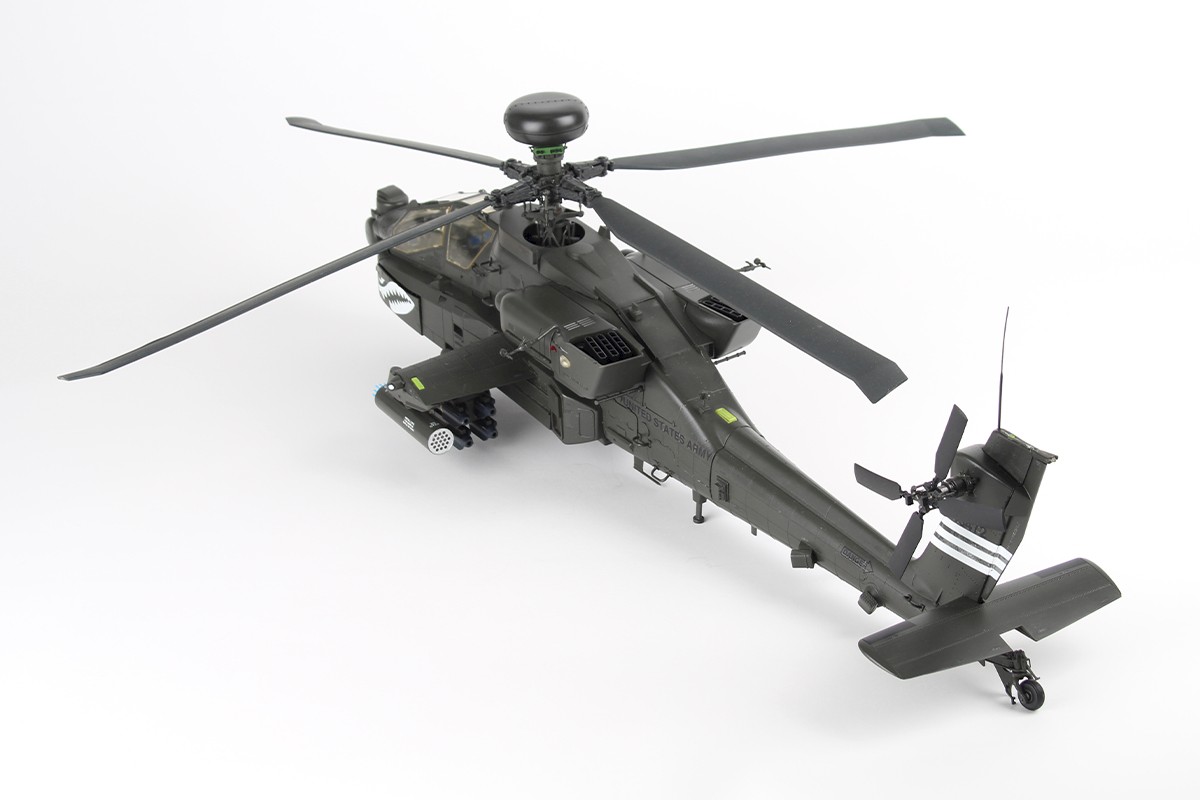 Notre modèle à l'échelle 1/24 est une réplique authentique de l'hélicoptère d'attaque AH-64D Apache Longbow avec son rotor principal et son rotor de queue motorisés, ses lumières, son bruit ainsi que ses missiles (DAGR, AGM-114), ses lanceurs de missiles (M261), ses rangements, ses roquettes (FIM-92 Stinger, CRV7), ses quatre réservoirs de carburant et son kit de skis.