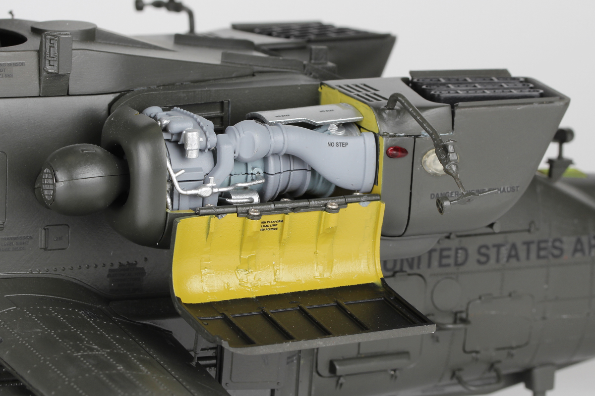 Votre modèle comprend un socle qui alimente les rotors et qui est suffisamment grand pour exposer l’Apache ainsi que tout son armement.