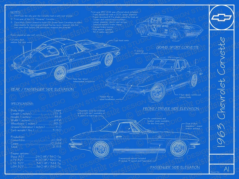 Toutes les voitures de 1963 avaient des moteurs qui faisaient 253ch (186kW) en standard, avec des variantes en option qui faisaient 304ch, 345ch et 365ch (224kW, 254kW et 268kW respectivement). Le moteur le plus puissant était le moteur à injection de Rochester. Les options disponibles sur la C2 comprenaient la radio AM-FM (mi-1963), la climatisation et le rembourrage en cuir. Un ensemble d'équipement de performance spécial, le RPO Z06, était également disponible pour la première fois sur une Corvette, pour 1'818,45 dollars. Ces Corvette sont connues sous le nom de « Big Tanks » parce que la finition avait initialement un réservoir d'essence de 138 litres par rapport aux 76 litres standard pour des courses telles que Sebring et Daytona. Au début, la finition n'était disponible que sur les coupés car le réservoir surdimensionné ne pouvait pas rentrer dans le cabriolet.