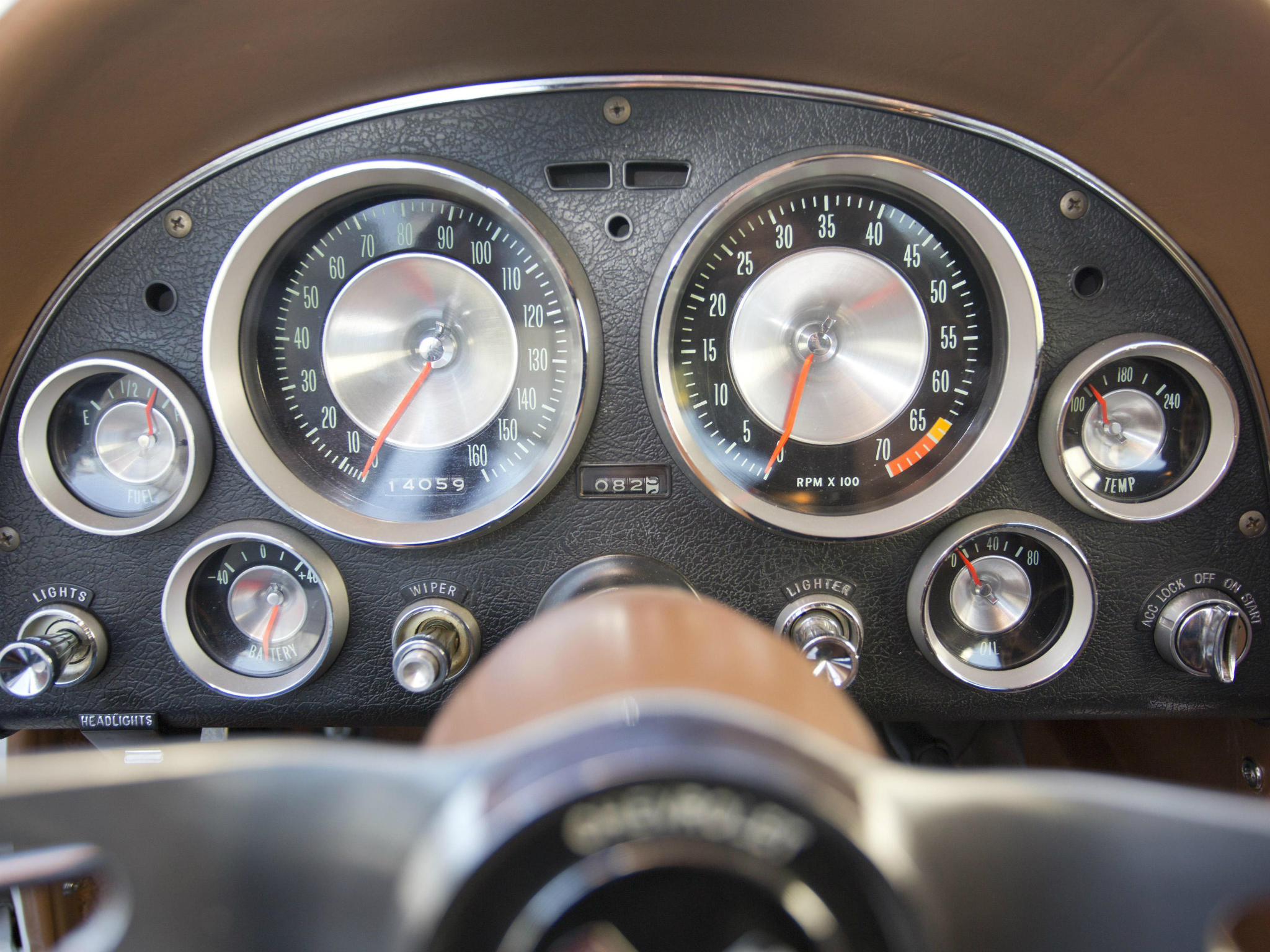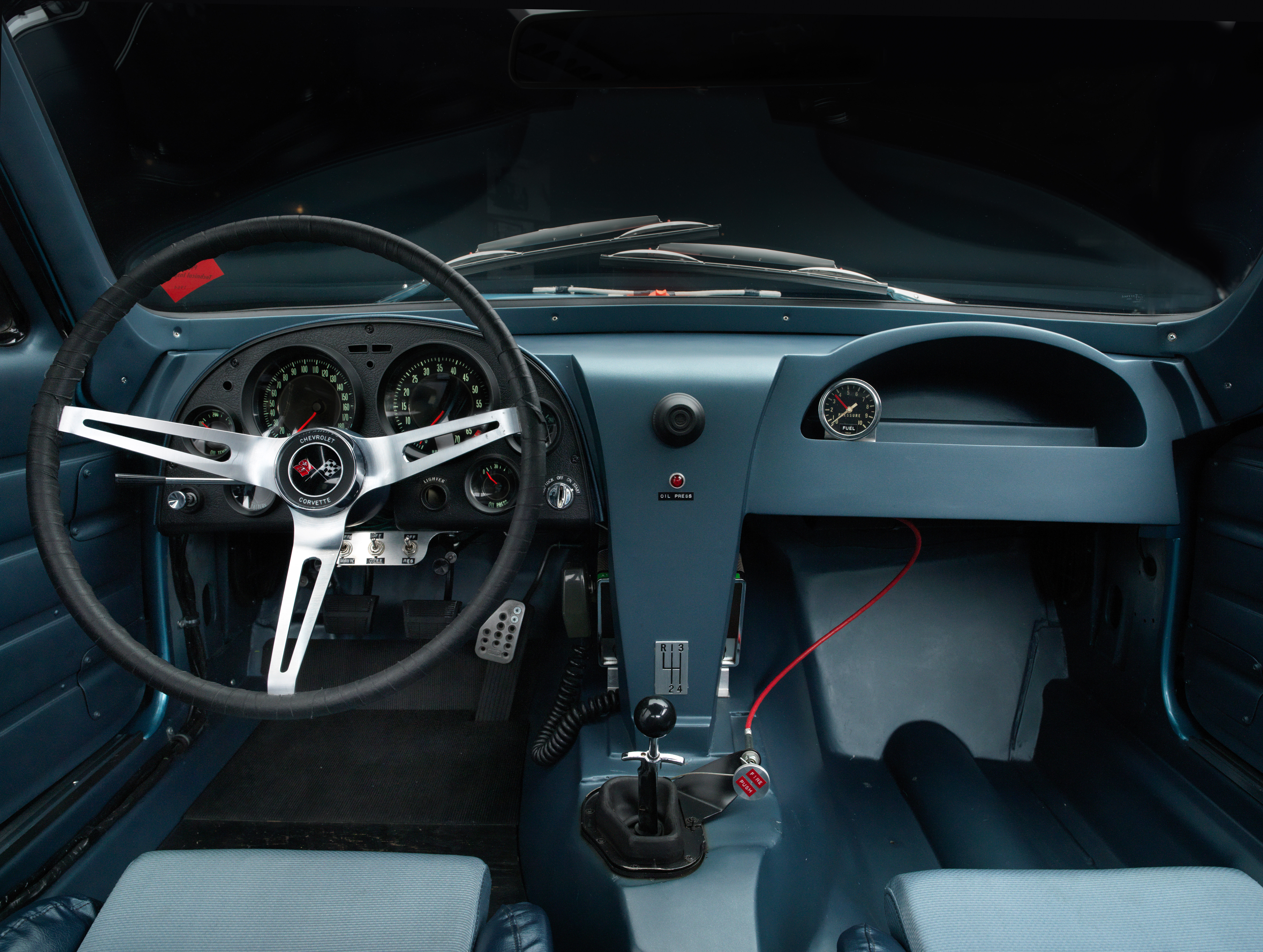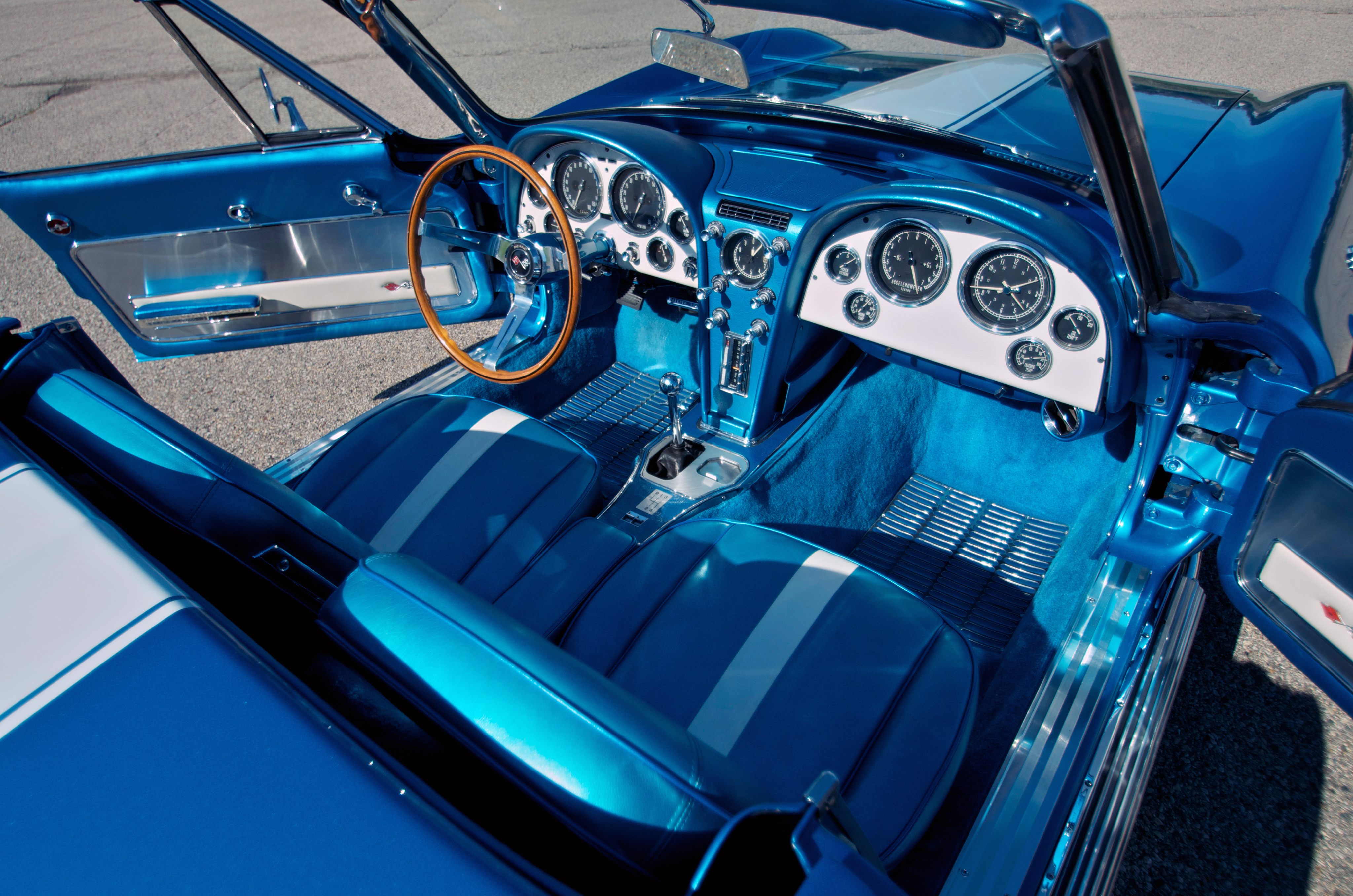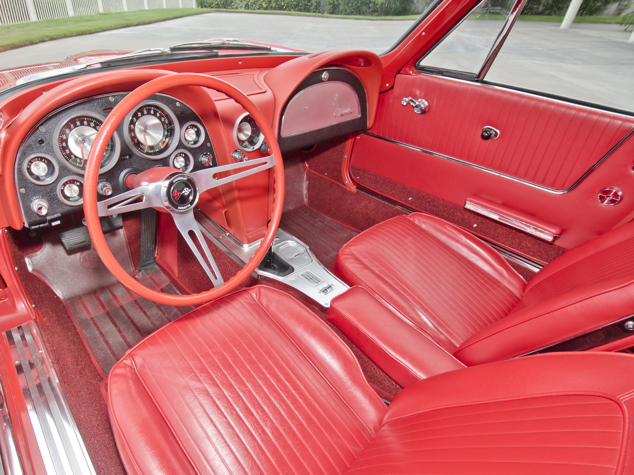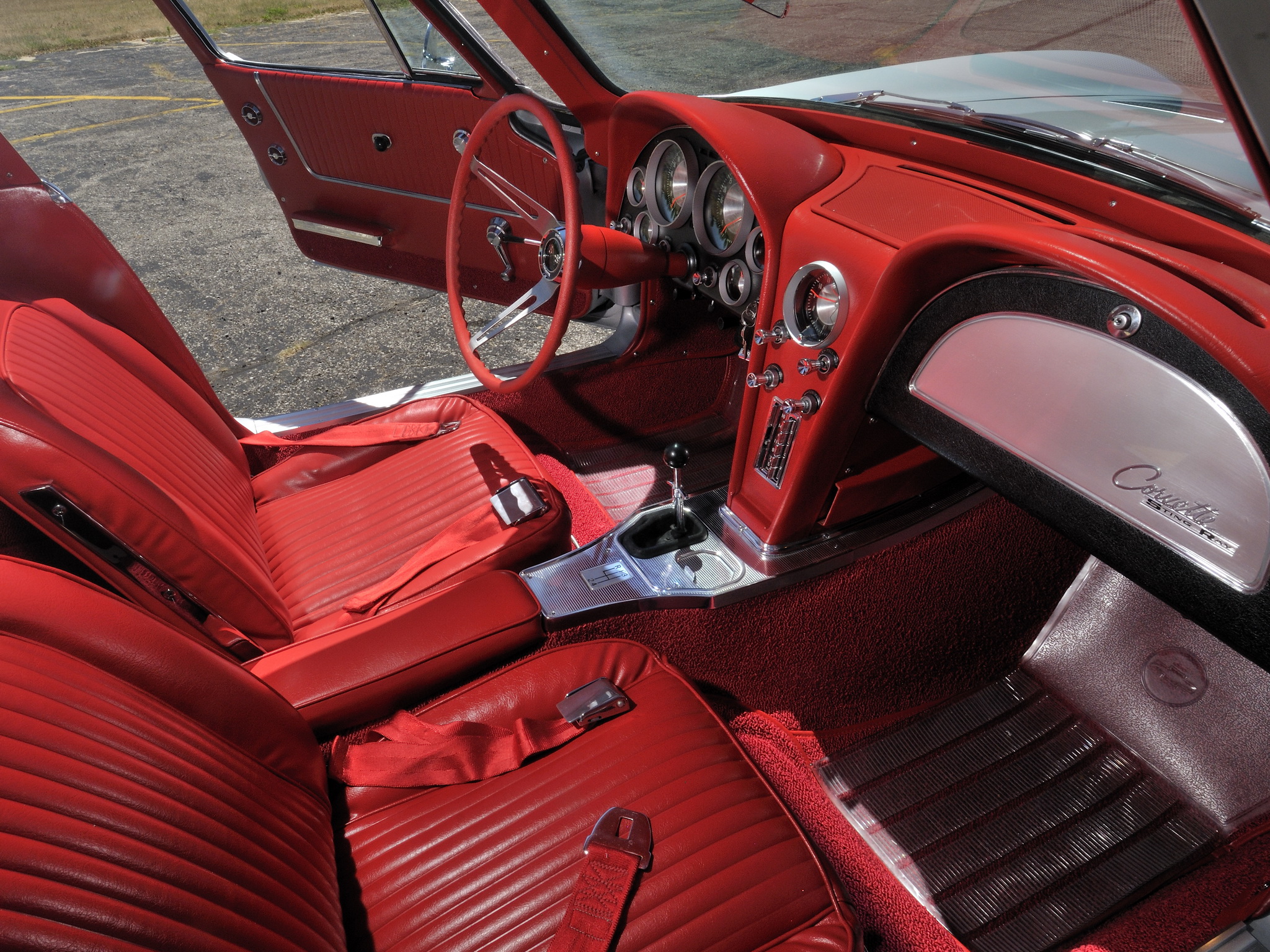 L'intérieur de la Sting Ray portait une réinterprétation du motif à double capot du tableau de bord de la Corvette depuis 1958, mais aussi un plus pratique, intégrant une boîte à gants spacieuse, un chauffage amélioré et le système de ventilation du capot. Un ensemble complet de jauges rondes comprenait un énorme compteur de vitesse et un tachymètre. La console centrale de la tour de contrôle est revenue, un peu plus mince mais contenant maintenant l'horloge et une radio située verticalement. L'espace à bagages a également été amélioré, bien qu'en raison de l'absence d'un couvercle de coffre externe, le chargement doit être chargé derrière les sièges. Le pneu de secours était situé à l'arrière dans un boîtier déroulant en fibre de verre sous le réservoir d'essence (qui contenait maintenant 76 litres au lieu de 61 litres). Le grand emblème rond du coffre a été articulé pour servir de volet de remplissage de carburant, remplaçant la porte du flanc gauche précédente.