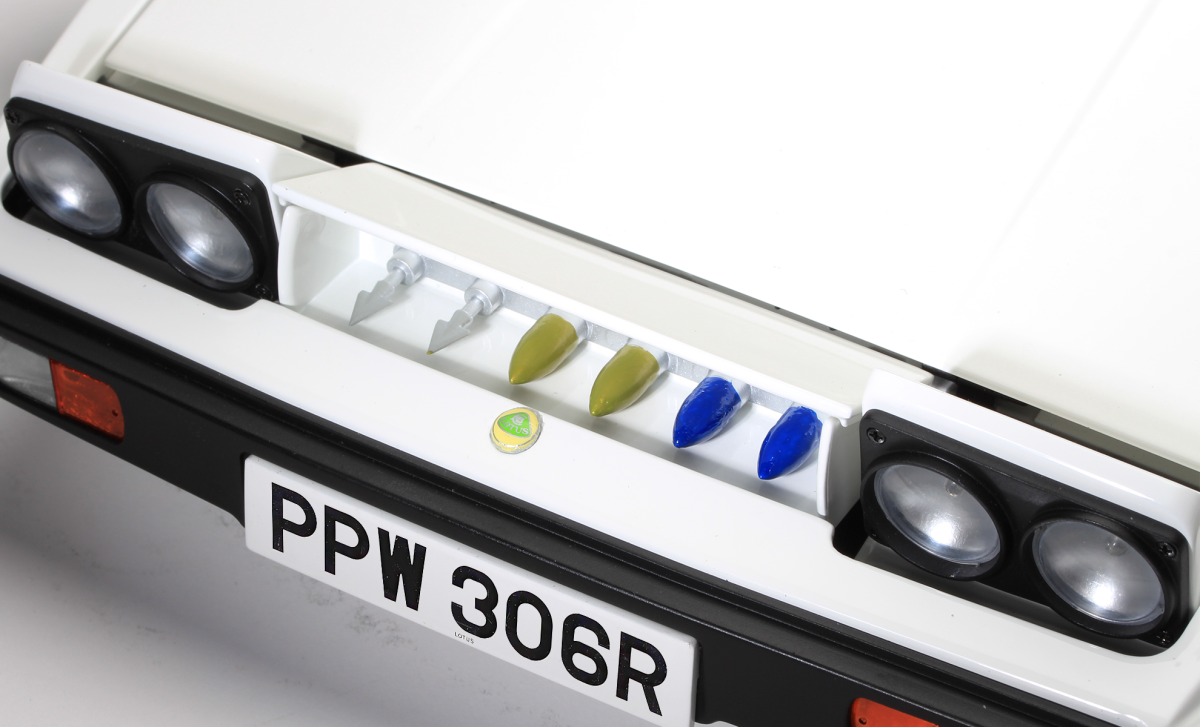 Toutes les caractéristiques de cette Lotus Esprit à haute performance sont reproduites de manière authentique y compris le moteur 4 cylindres 907, les phares escamotables, les feux de freinage et les clignotants fonctionnels ainsi que les insignes détaillées. La carrosserie moulée sous pression correspond à la couleur blanche Monaco White.