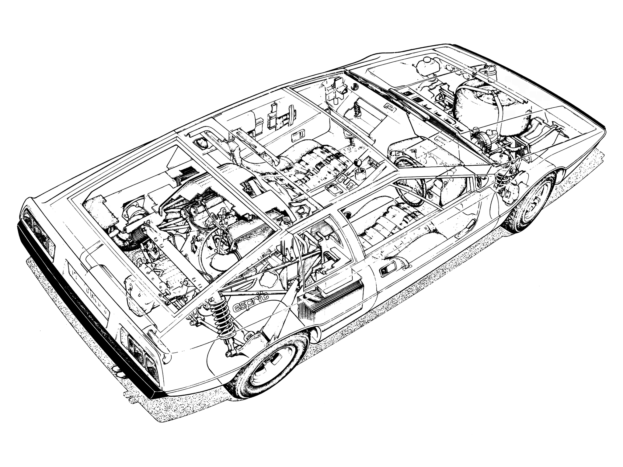 L'Esprit a été l'un des premiers modèles de « papier plié » polygonaux (presque) droits, à bords durs pliés et parfois en forme de coin, du prolifique et très réussi designer industriel et automobile italien Giorgetto Giugiaro. Le châssis de l'Esprit a ensuite été adapté pour supporter la carrosserie de la voiture DeLorean, une autre voiture de sport surbaissée, dessinée par Giugiaro, aux plis nets et en forme de coin. En 1978, les premières mises à jour ont conduit à la série 2 et aux moteurs Esprit S2.2 de 2,2 litres (134 pouces cubes), fabriqués jusqu'aux modèles Série 3 et Turbo Esprit de 1982 à 1988, qui utilisaient un ensemble de restylage aérodynamique et esthétique conçu par Giugiaro de 1980.