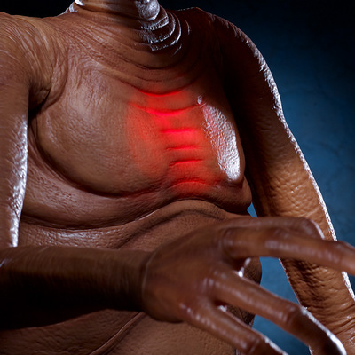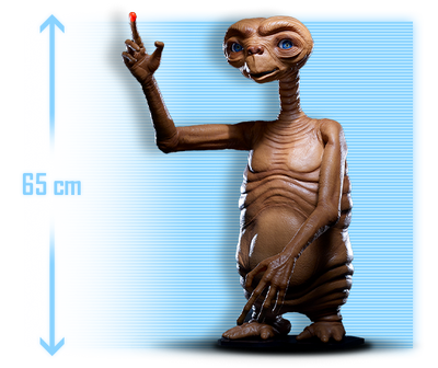 : E.T. en portrait de 3/4 profil droit avec son doigt levé et illuminé