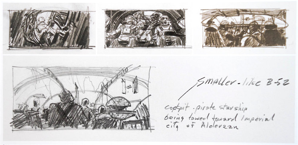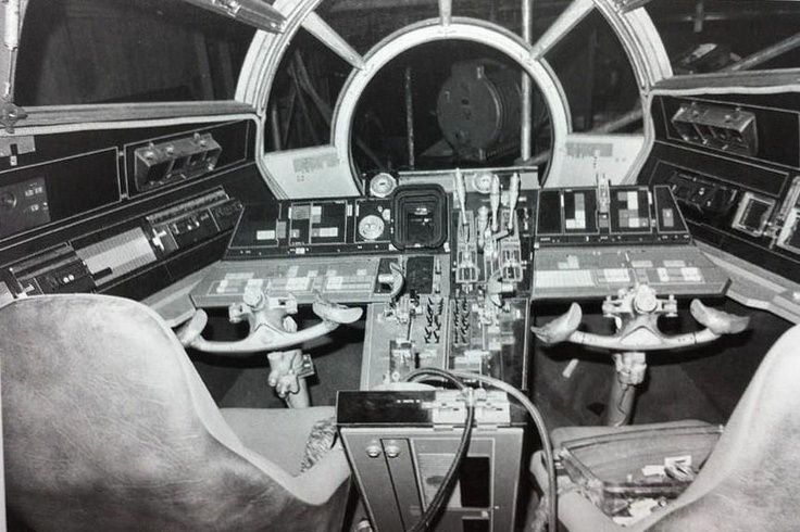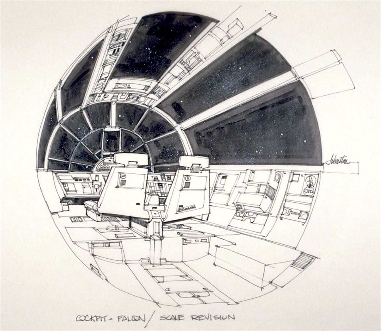 En effet, la conception de base du cockpit original d’ANH remonte aux premiers croquis conceptuels de Ralph McQuarrie au milieu des années 1970, lorsque le Faucon était encore connu sous le nom de « bateau pirate » (the pirate ship). Ce n’était pas censé être un tube futuriste blanc de science-fiction standard, bordé d’écrans lumineux. Au lieu de cela, ses influences militaires de la Seconde Guerre mondiale étaient claires - George Lucas voulait qu’il ressemble à un cockpit de bombardier américain B-29 encombré et encombré, mis à jour pour l’espace (le croquis ci-dessus fait référence à un B-52, mais c’est probablement une erreur puisque les bombardiers B-29 avaient les fenêtres rondes caractéristiques alors que les B-52 n’en avaient pas).