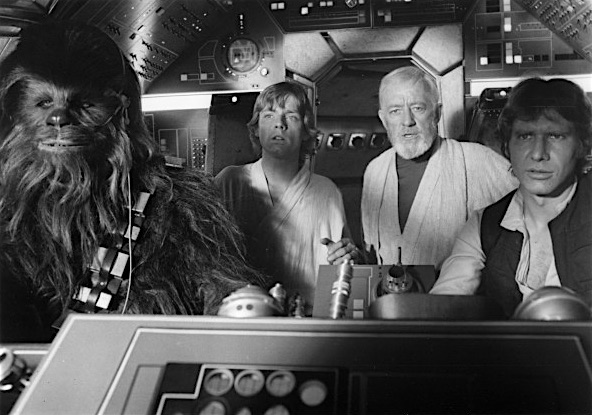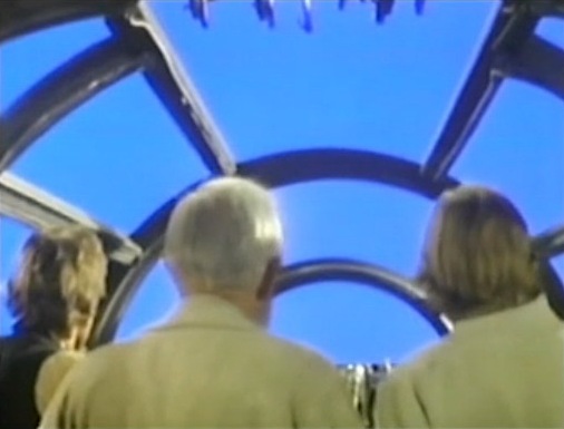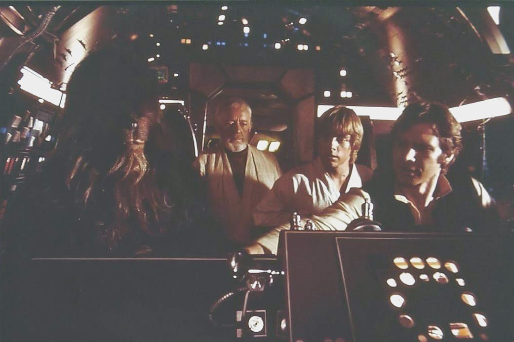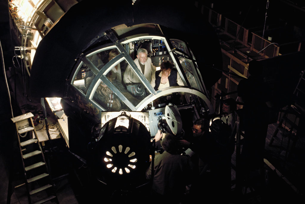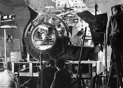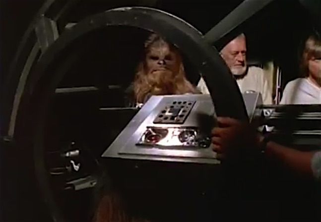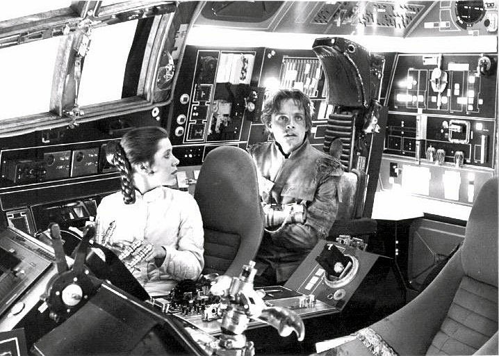 Le cockpit était un décors autonome séparé et construit sur un simple support de rostre qui lui permettait d’être poussé et secoué par des machinistes, simulant des impacts laser ou les tendres ministrations d’un faisceau tracteur. La vue ci-dessous montre l’un des machinistes au travail, et Alec Guinness apparemment dans la douleur d’avoir à effectuer un dialogue aussi « nul » (comme il l’a appelé dans une lettre à un ami).