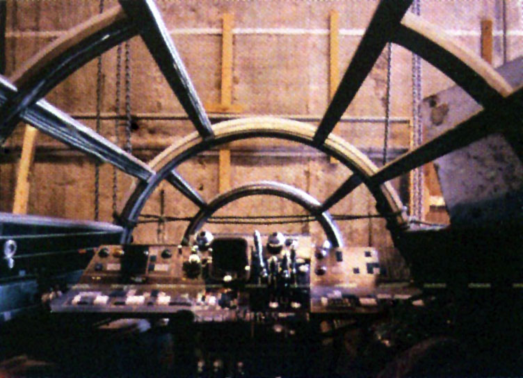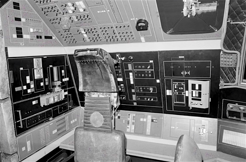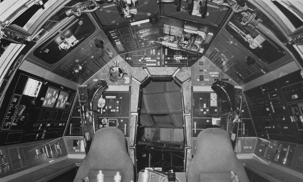 L’intérieur du cockpit d’origine se composait de surfaces de panneaux inclinées plates bordant les parois du tube et d’une console centrale en forme de T, décorée de lignes contrastantes faites de ruban à rayures étroites - peut-être le ruban Letraline de Letraset. Les panneaux étaient recouverts d’arrangements rectilignes de lumières, de bascules physiques et d’interrupteurs à bascule, et de morceaux aléatoires de matériel trouvé, dont beaucoup ont été récupérés dans de vieux avions. Les lumières étaient principalement en plastique acrylique translucide rétroéclairé ou des ampoules miniatures physiques à incandescence.Il n’y a pas d’écriture, et il n’y a pas de symboles.