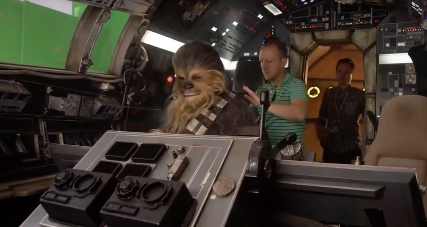 Notez comment les acteurs sont baignés de lumière bleue de l’extérieur. C’est parce que le cockpit n’a pas été construit autour d’écrans bleus, comme les décors originaux. À l’époque, ils devaient ajouter les scènes à l’extérieur de la fenêtre en utilisant le compositing optique, de sorte que les acteurs devaient répondre aux écrans bleus noirs. Le cockpit Solo a été construit autour d’énormes écrans de projection LED, sur lesquels des images de synthèse réelles ont été projetées en temps réel. Cela signifie que les acteurs pouvaient réellement voir les scènes extérieures qu’ils sont censés jouer. Cela signifie également qu’il n’est pas nécessaire de composer les effets plus tard - les choses sont déjà là à huis clos. De plus, toutes les couleurs de l’extérieur finiront par teinter des surfaces plus claires à l’intérieur du décor, pour plus de réalisme.