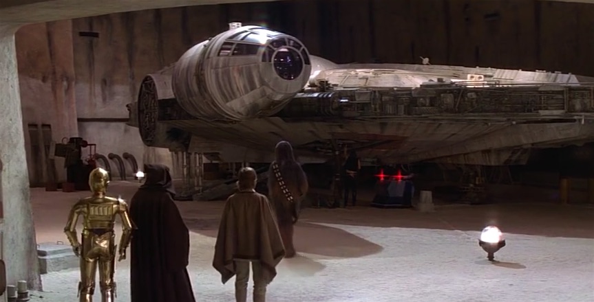 L’extérieur du Faucon a été conçu par Joe Johnston et l’équipe qui est devenue plus tard ILM en Californie, mais les décors intérieurs tels qu’ils apparaissent dans le film ont été conçus et construits par une équipe de scénographes britanniques, puisque l’action en direct a été tournée aux studios EMI Elstree en Angleterre. Les dessins et peintures de Johnston et Ralph McQuarrie ont servi de points de départ.