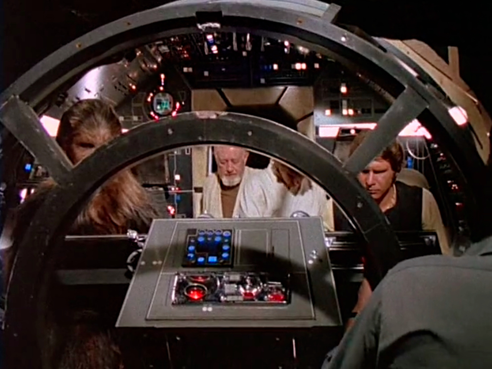 L’écran central du moniteur de tableau de bord a également été montré en fonctionnement. Au moins, cela a été démontré par implication – Han et Leia sont censés examiner les cartes des étoiles dessus, mais seulement en étant baignés dans la lumière bleue. L’affichage n’est jamais montré au public dans aucun film. Le tableau de bord central a quelques contrôleurs manuels supplémentaires.