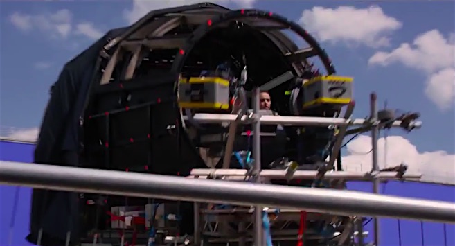 Comme dans les films précédents, le cockpit est sa propre unité autonome, avec un couloir de stub ne menant nulle part. Cependant, plutôt que de simplement monter le cockpit sur quelques supports et de laisser des machinistes secouer les choses, le cockpit TFA pourrait être transféré à un énorme mécanisme hydraulique qui permettait à un téléopérateur de secouer et de claquer violemment tout le cockpit avec un effet dramatique.
