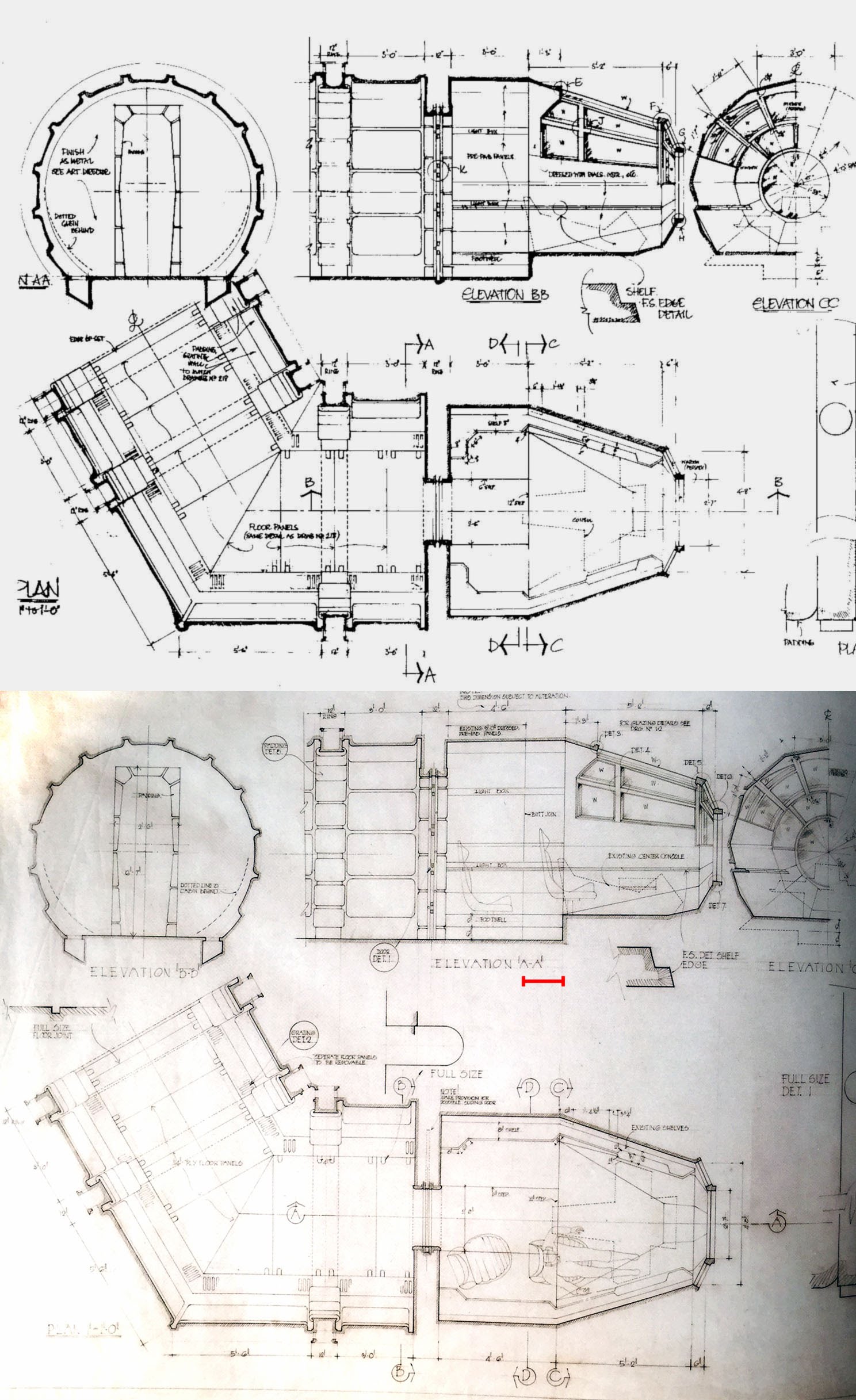 Il est évident que les plans ESB sont une copie directe des plans ANH, mais la section médiane du cockpit est légèrement plus longue, comme je l’ai indiqué ici en rouge. Alors que le cockpit ANH a une profondeur de 3 pieds (91,44cm), le cockpit de l’ESB a une profondeur de 4 pieds 6 pouces (140,20cm), bien que le plan ajoute des « dimensions sujettes à modification ». Cependant, la boîte de tableau de bord Volvo 343/345 sur le côté du décor ESB mesure 1 pied 1 pouce (33,53cm) de large, il semble donc que la mesure de profondeur supplémentaire de 18 pouces soit correcte.