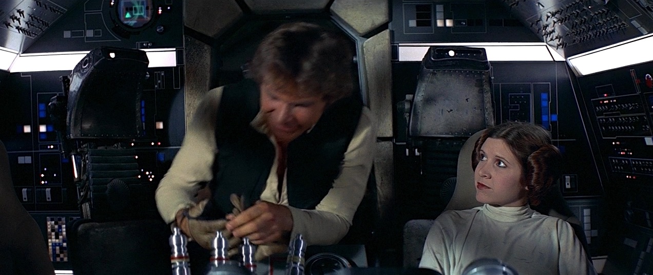Le cockpit a un tableau de bord en forme de T avec une console centrale entre Han et Chewie, et un panneau avant. Toutes sortes de commandes ornent cette chose – principalement des interrupteurs et des boutons-poussoirs.