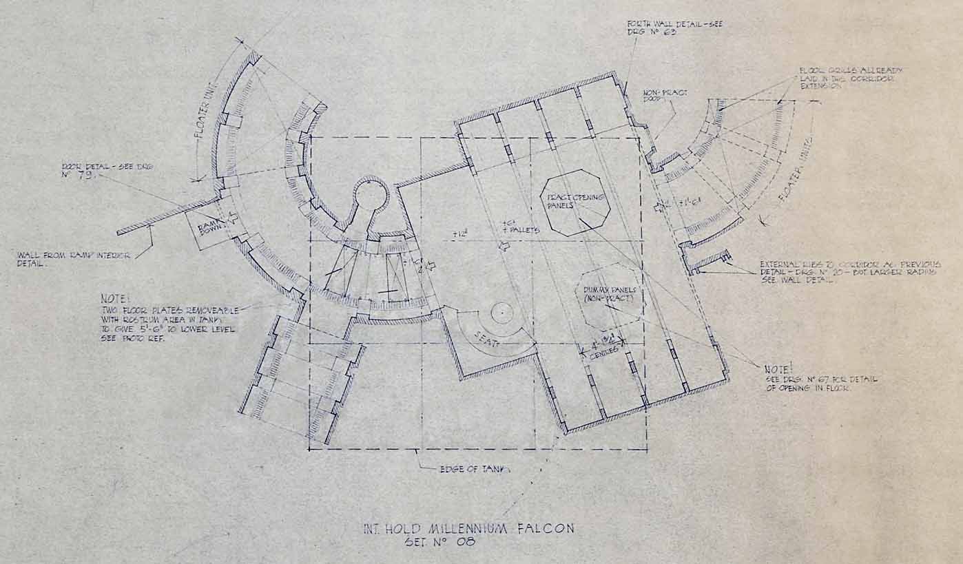 Incidemment, vous vous demandez peut-être comment la scène où Han tente de réparer le Faucon dans ESB a été filmée. Parce que, bien-sûr, il va dans une fosse de plancher bien en dessous du niveau du sol. C’était un mystère pendant longtemps, mais en 2017, un plan défini est apparu aux enchères, ce que j’ai trouvé révélateur de l’astuce. Le décor de la soute a été construit dans un studio (EMI stage 8) qui avait un réservoir de 9 pieds (2,75 mètres) de profondeur dans le plancher, et des renfoncements ont été construits sous le plancher. Ceci est similaire à l’approche utilisée dans le hangar de l’Étoile de la Mort dans ANH - le réservoir a été utilisé là pour le trou d’ascenseur dans le sol.