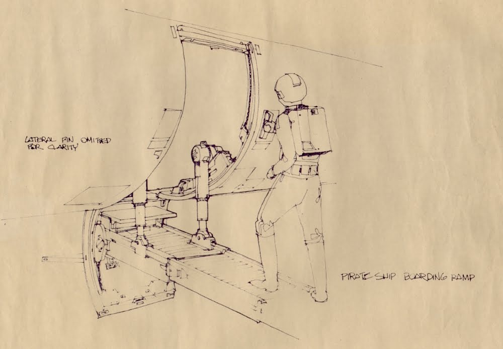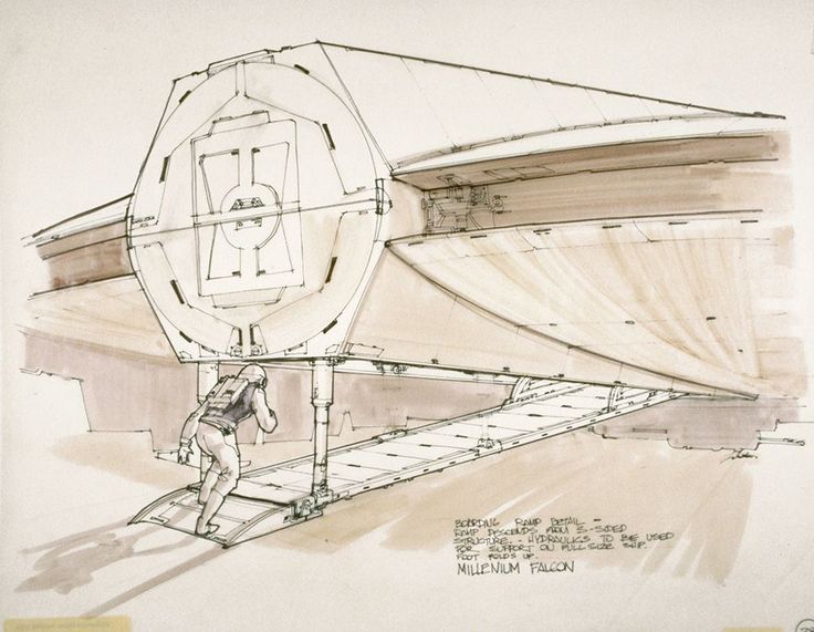 Le croquis de production précoce de Joe Johnston pour une rampe du Faucon, à l’époque où il s’agissait d’un « bateau pirate » linéaire, montre une autre idée de rampe, avec des entretoises télescopiques pivotantes et un point de pivot au sommet.