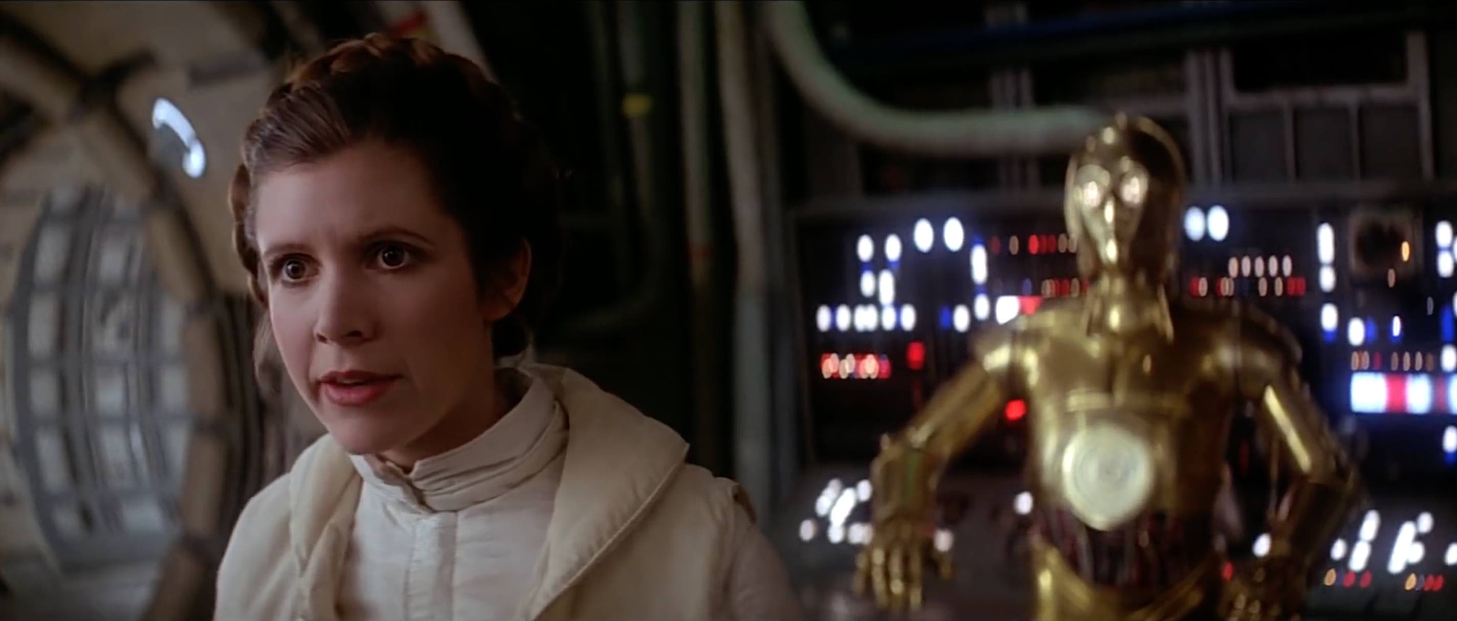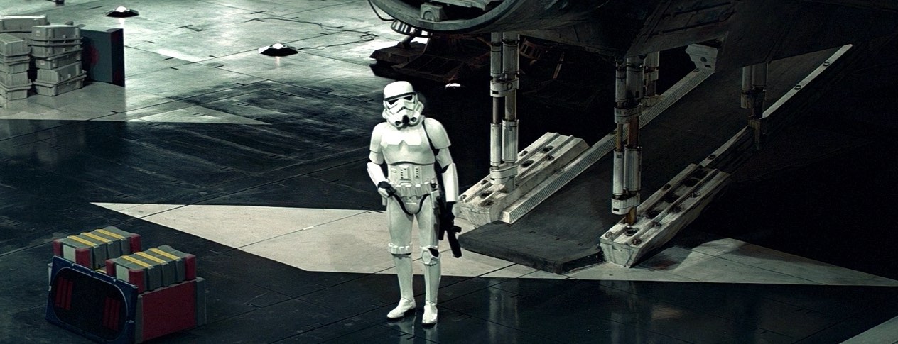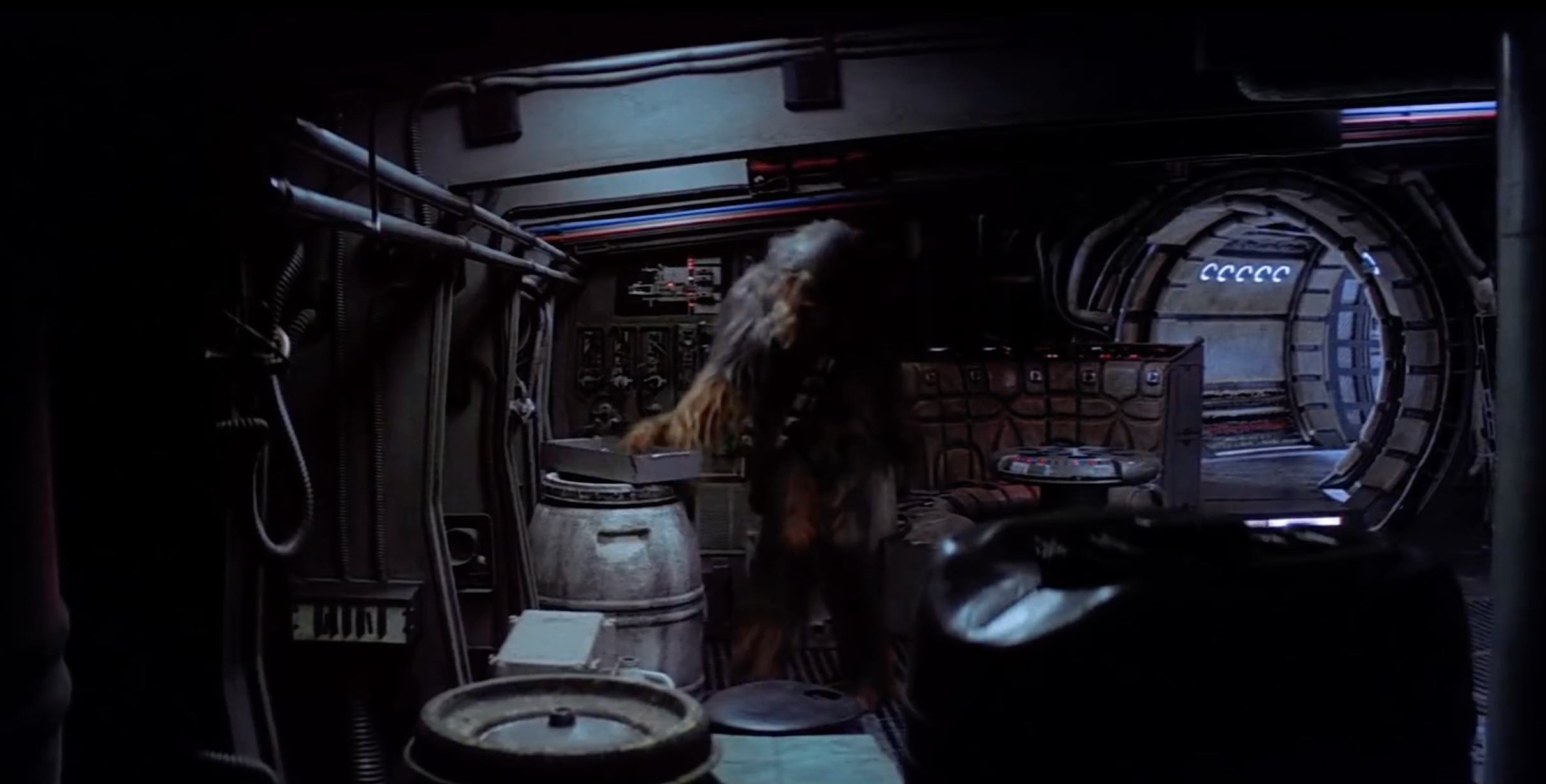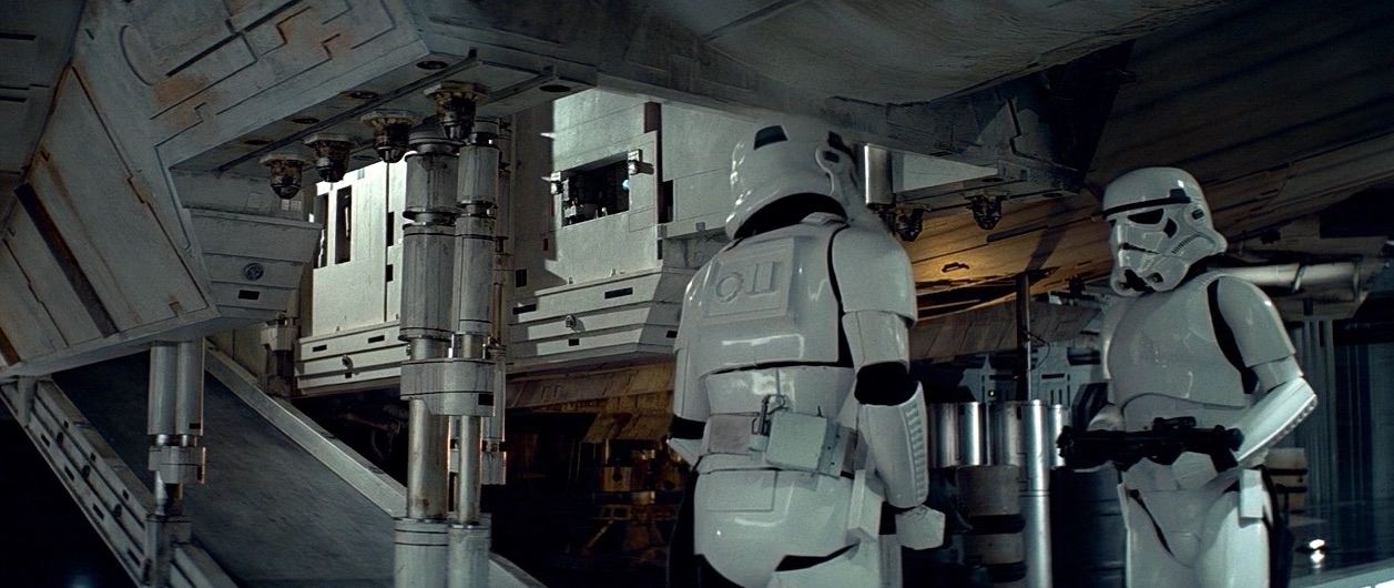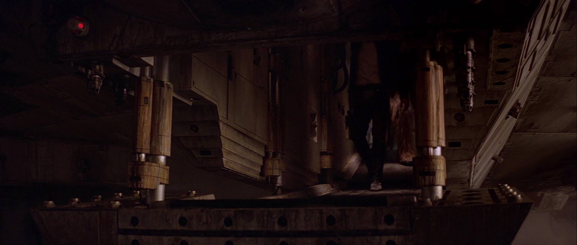 Dans les 2 scènes où les côtés intérieurs de la rampe sont visibles (le Faucon extérieur pour la scène du hangar et le couloir interne pour la scène du compartiment caché), la rampe est éclairée latéralement et non éclairée par le haut. L’angle des ombres montre clairement que des lampes de studio sur des supports ont été utilisées, et non des plafonniers intégrés dans le décor.