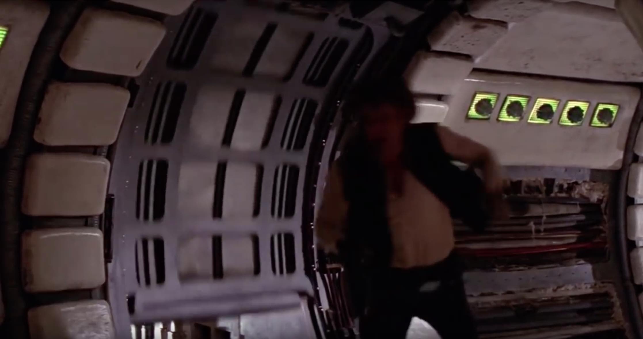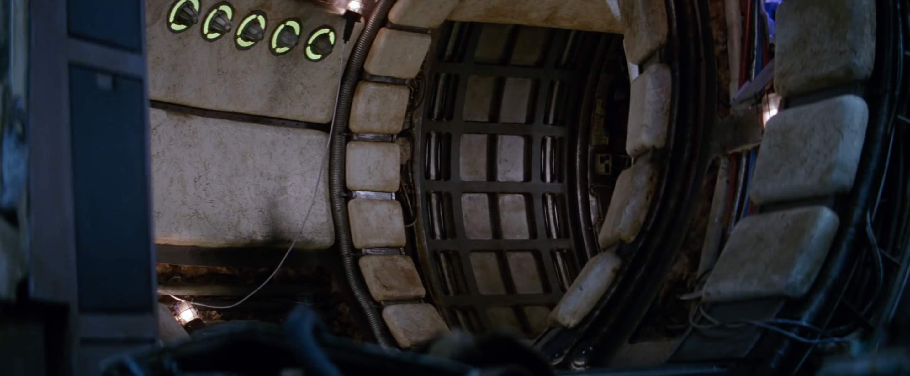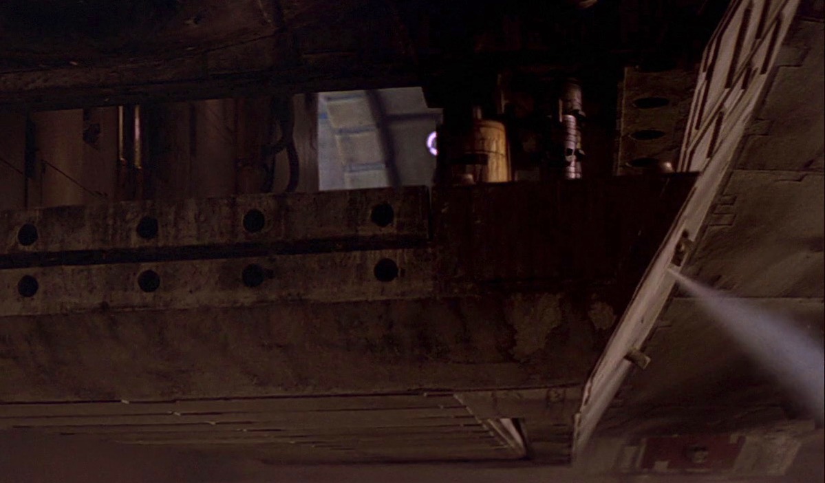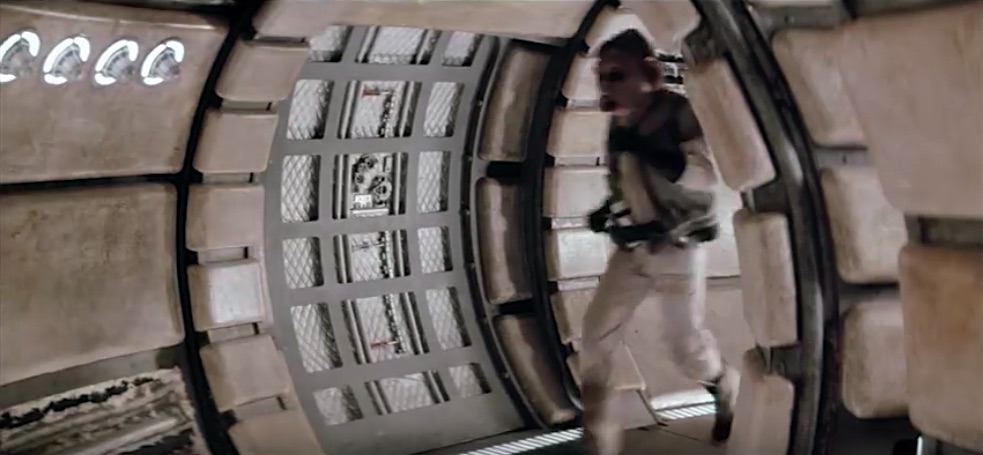 L’extrémité de la rampe a une lourde porte incurvée qui descend pour couper le couloir de l’extérieur, ce qui a un certain degré de sens puisqu’elle fonctionnerait comme un sas. La courbure de la porte correspond à la courbure du couloir lui-même. Han est montré en train d’appuyer sur un bouton pour libérer la porte, mais il semble que le décor réel ait simplement eu une porte actionnée par gravité qui a été treuillée à la main, puis laissée glisser rapidement vers le bas. En 2015, Harrison Ford a fait une remarque grincheuse sur cette porte, disant qu’elle était actionnée par des poulies, mais à quel point ce commentaire de chat show fait autorité, qui sait ? Il ne semblait pas certain s’il y avait eu une porte ou non 40 ans plus tôt.