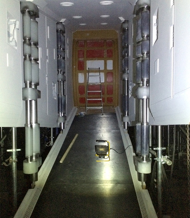 Vous remarquerez qu'une paire des 3 paires de vérins hydrauliques est visible. Et ils sont comme je l'avais théorisé - des poteaux métalliques solides sur de simples points de pivot. 2 chaînes sont également évidentes à chaque point - une tenant chaque poteau peint en violet et une autre à côté, vraisemblablement porteuse.