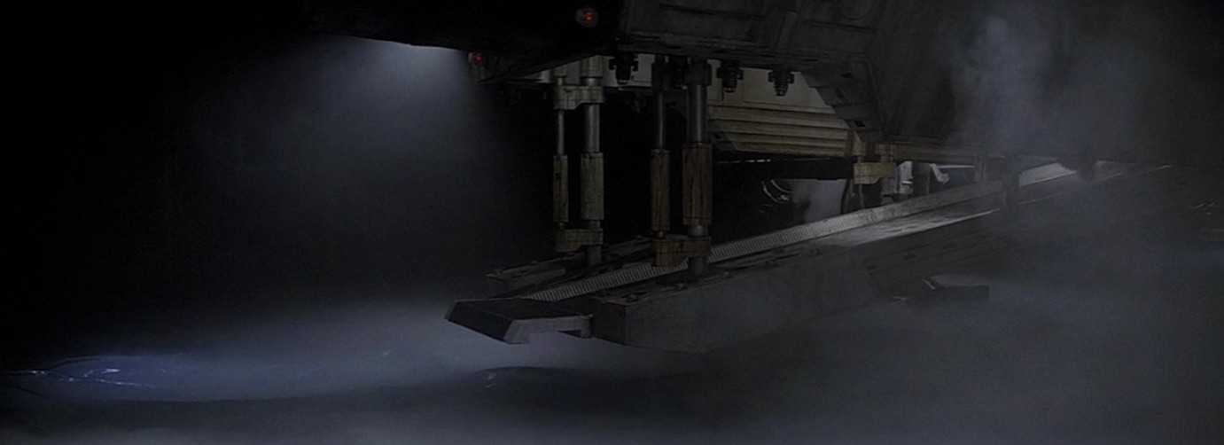 L'Empire contre-attaque (1980). Les séquences filmées (l’intestin de la limace spatiale et les séquences d’arrivée de Bespin) et les photos des coulisses montrent clairement 3 bassins de lumière distincts illuminant la rampe. D’autres photos des coulisses montrent des paires de plafonniers, bien qu’aucune ne montre tout le plafond.