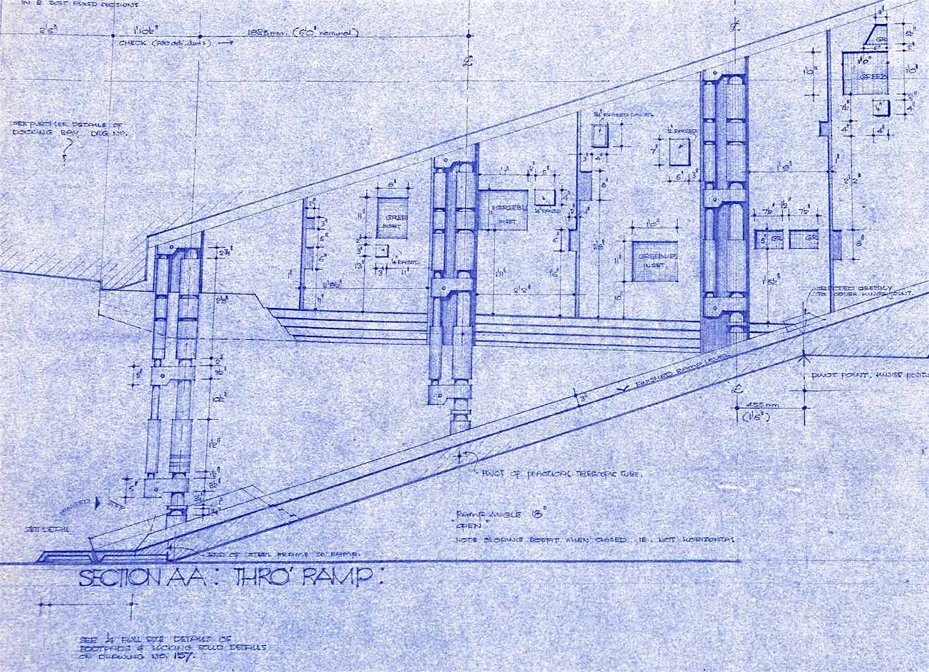 Enfin, un détail mineur concerne les grands blocs rectangulaires de chaque côté de la base de la rampe. Ceux-ci contiennent un certain nombre de trous et de poteaux saillants qui représentent un mécanisme de verrouillage qui maintient la rampe surélevée fermement fermée.