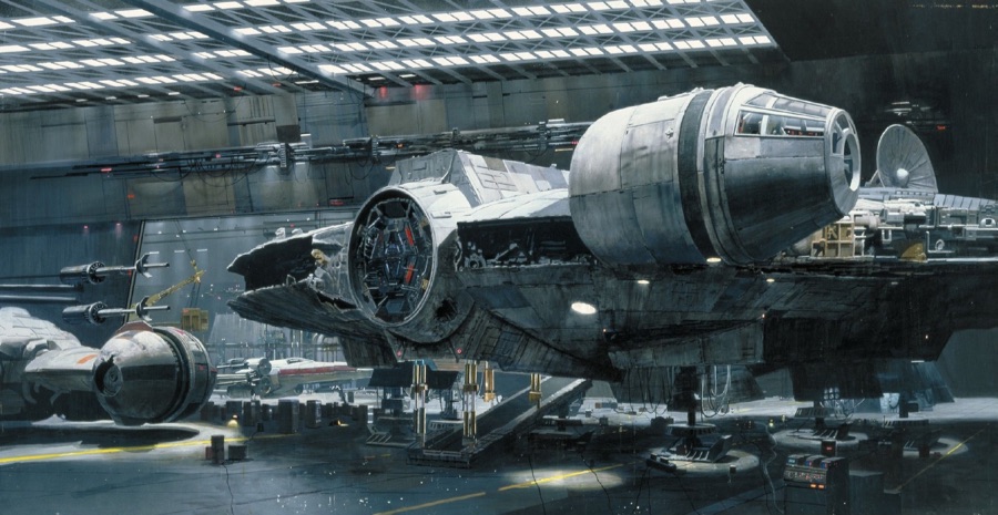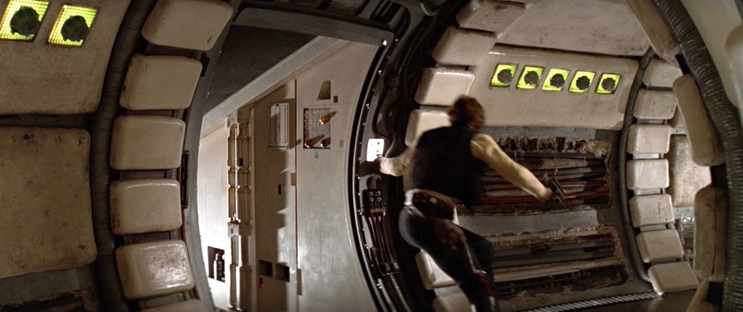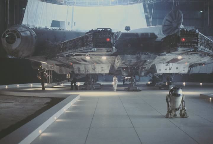 Le premier décor physique du Faucon, construit pour le film original Star Wars de 1977, (rebaptisé Star Wars : Un nouvel espoir ou ANH en 1981) n’avait en fait aucune lumière extérieure d’aucune sorte.