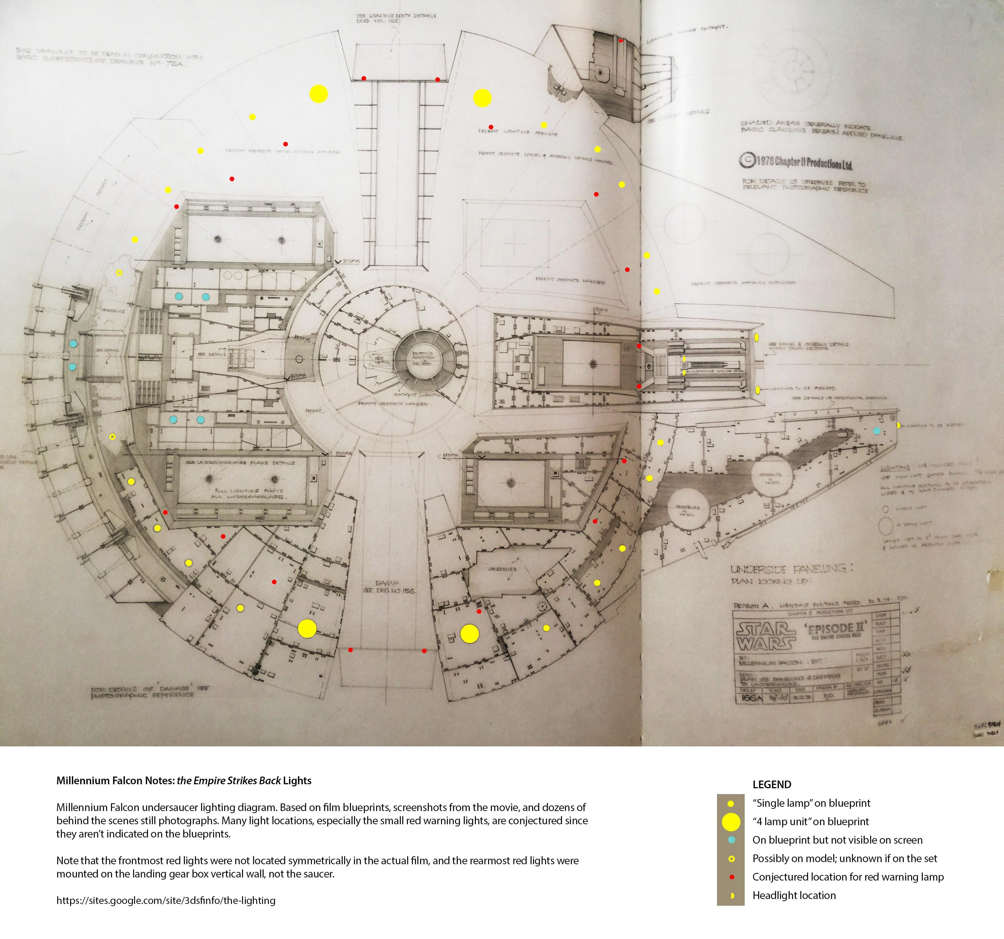 Schéma d’éclairage de la soucoupe du Faucon Millenium. Basé sur des plans de film, des captures d’écran du film et des dizaines de photographies des coulisses. De nombreux emplacements de lumière, en particulier les petits feux d’avertissement rouges, sont conjecturés car ils ne sont pas indiqués sur les plans.