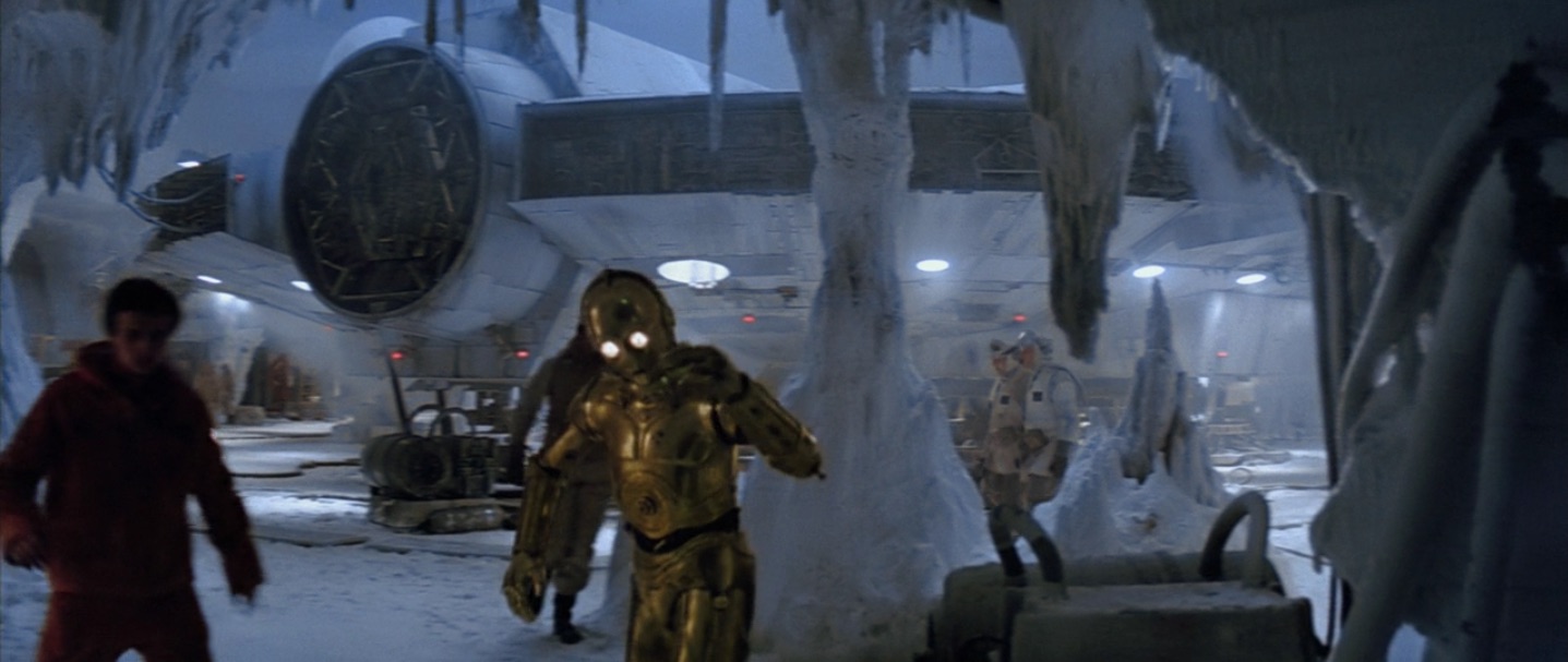 Les projecteurs ventraux apparaissent assez bleus dans ESB. Cependant, les plans indiquent que l’éclairage à quartz a effectivement été utilisé, qui a une lumière chaude au tungstène – une température de couleur d’environ 3'200K. Il est possible que des filtres bleus aient été installés sur les inondations, mais il semble plus probable que les séquences vidéo aient été chronométrées en couleur (ajustées) dans le laboratoire pour paraître plus bleues et plus froides, en particulier les séquences du hangar de Hoth.