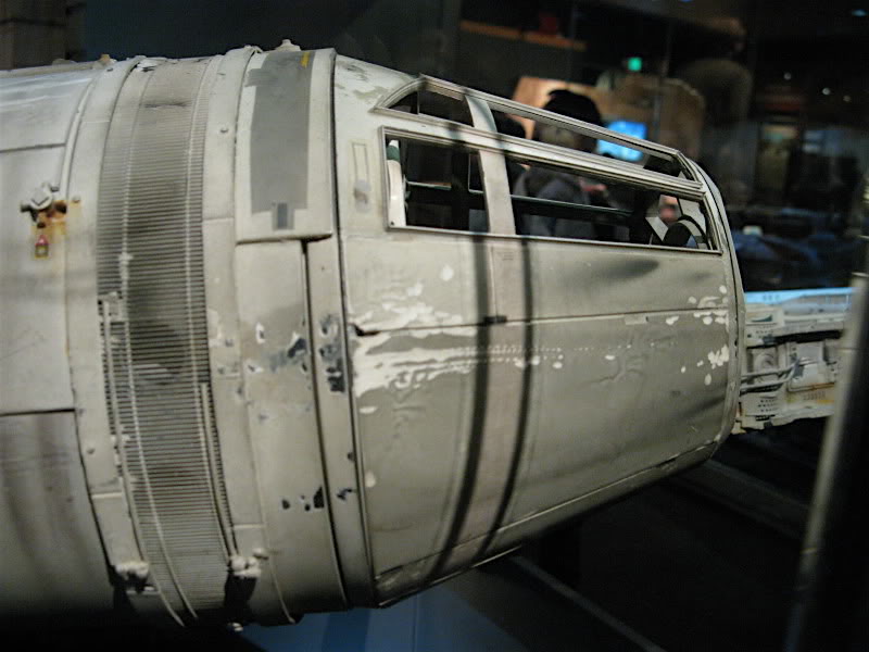 Certaines des plus petites positions lumineuses correspondent à de petits panneaux carrés avec des lampes situées au centre sur le modèle de 5 pieds. Cependant, les grandes lumières encastrées de chaque côté des anneaux d’amarrage sur le décor grandeur nature n’ont pas d’ouverture correspondante évidente sur les modèles 5 pieds ou 32 pouces.