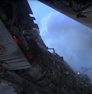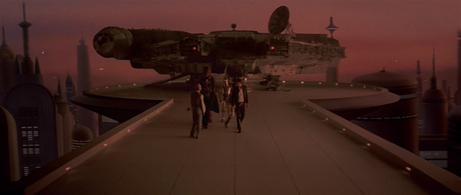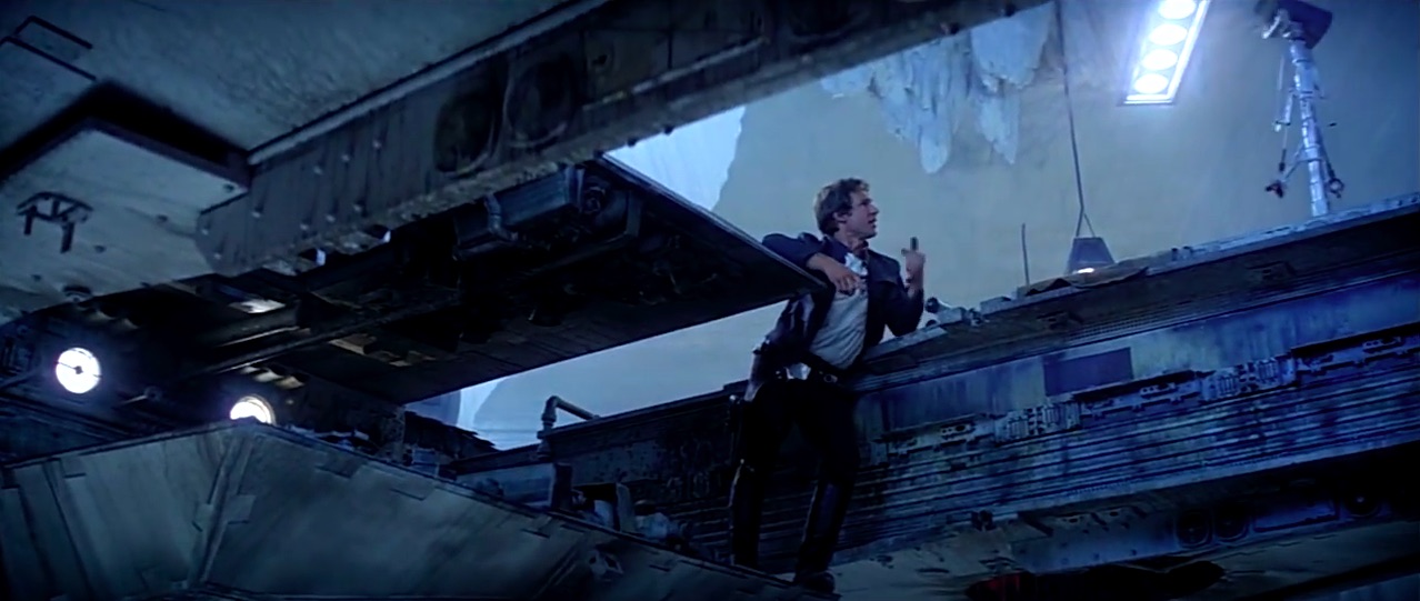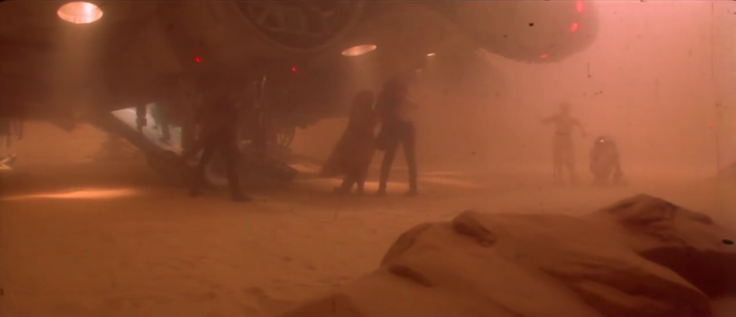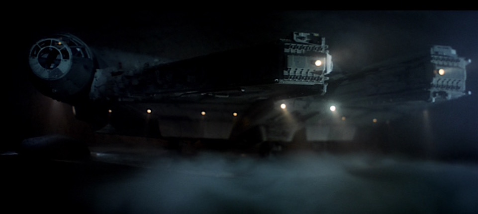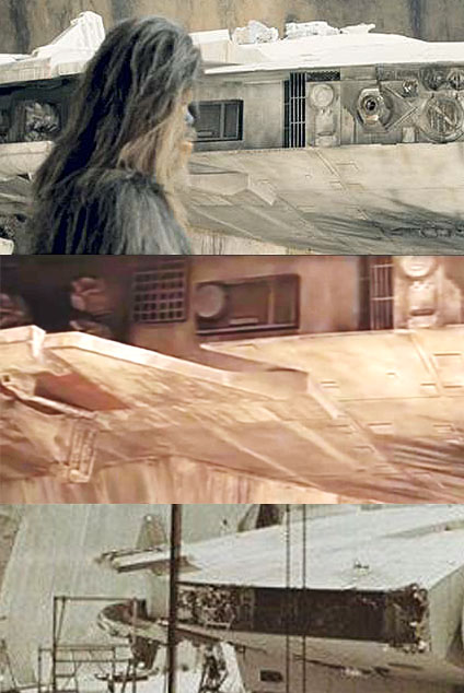 Dans ROTJ, il y a une scène où Lando et Han parlent devant le Faucon. Malheureusement, ce n'était pas une scène très convaincante - on aurait dit qu'ils parlaient devant une toile de fond inachevée. Même le jeu d'acteur semblait plutôt plat. Le matte painting, de Frank Ordaz, donne au Faucon un aspect un peu tronqué, en particulier le cockpit, et semble curieusement mettre un projecteur blanc sur le dessous du tube du cockpit.