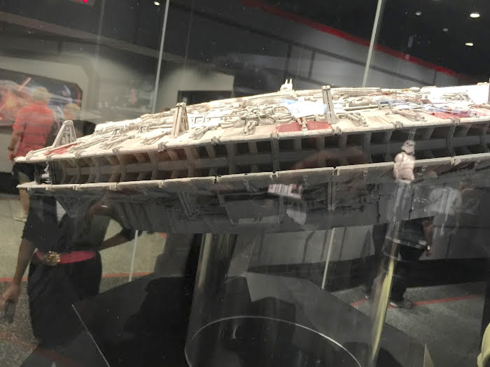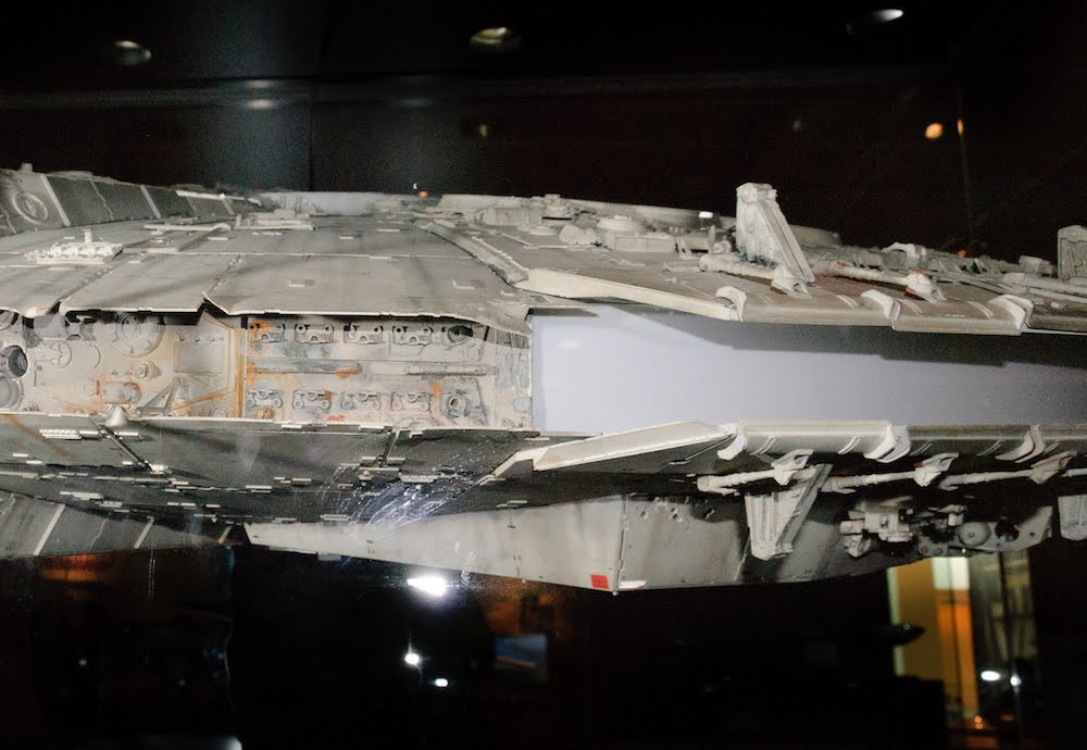 Dans le cadre de la commercialisation de TFA, Lucasfilm/Disney a construit un modèle physique promotionnel du Faucon. Il a été construit à l’aide d’actifs numériques et n’a jamais été utilisé comme modèle de prise de vue. On l’appelle généralement le Faucon « Launch Bay », car il a été utilisé dans une attraction touristique Star Wars de Disneyland du même nom. Ce Faucon « Launch Bay » semble avoir la conception du moteur vue dans TFA, mais la grille rectiligne extérieure est tout simplement manquante et semble un peu mauvaise. Étrange !