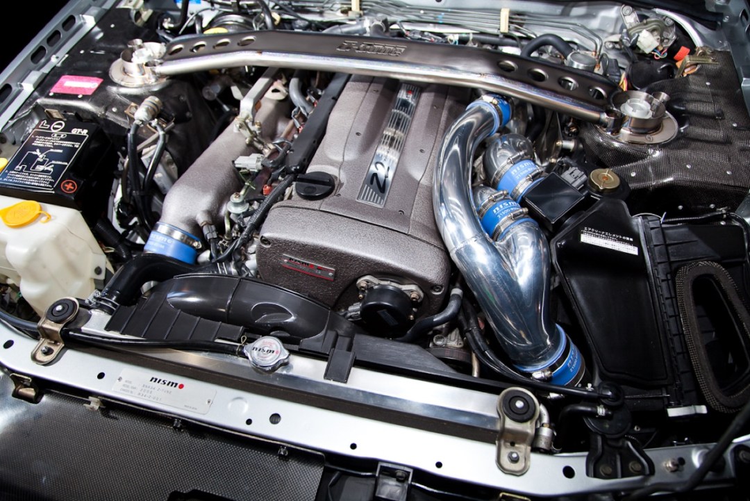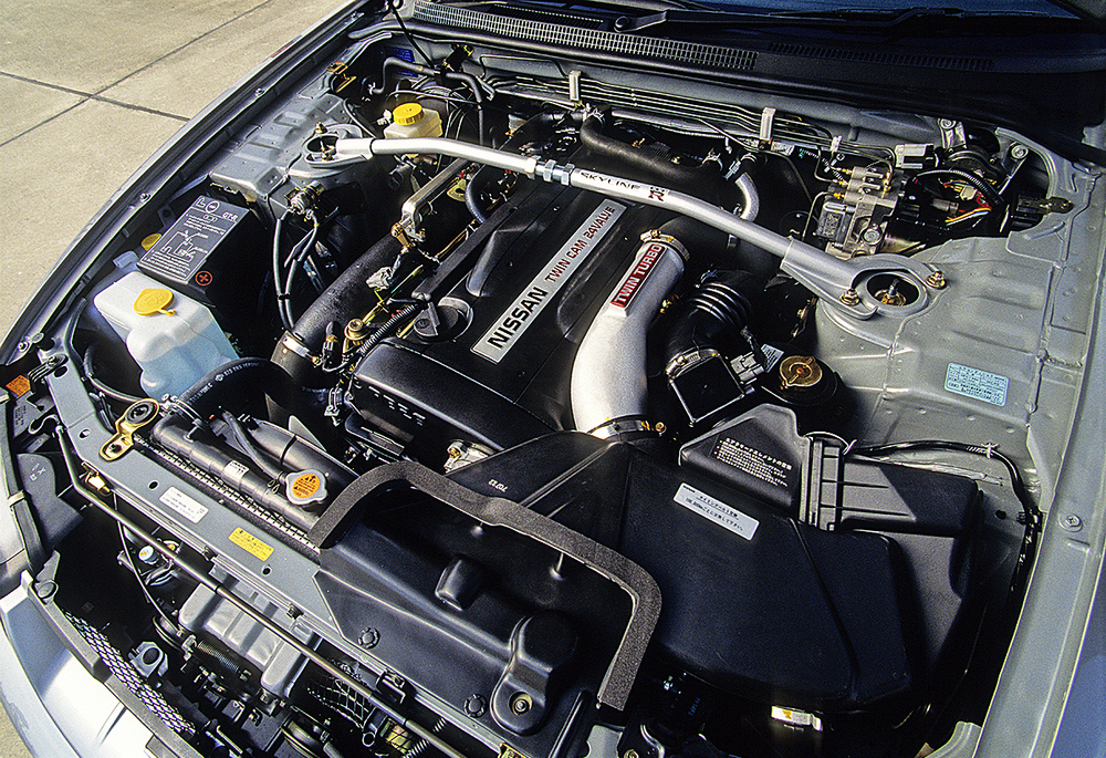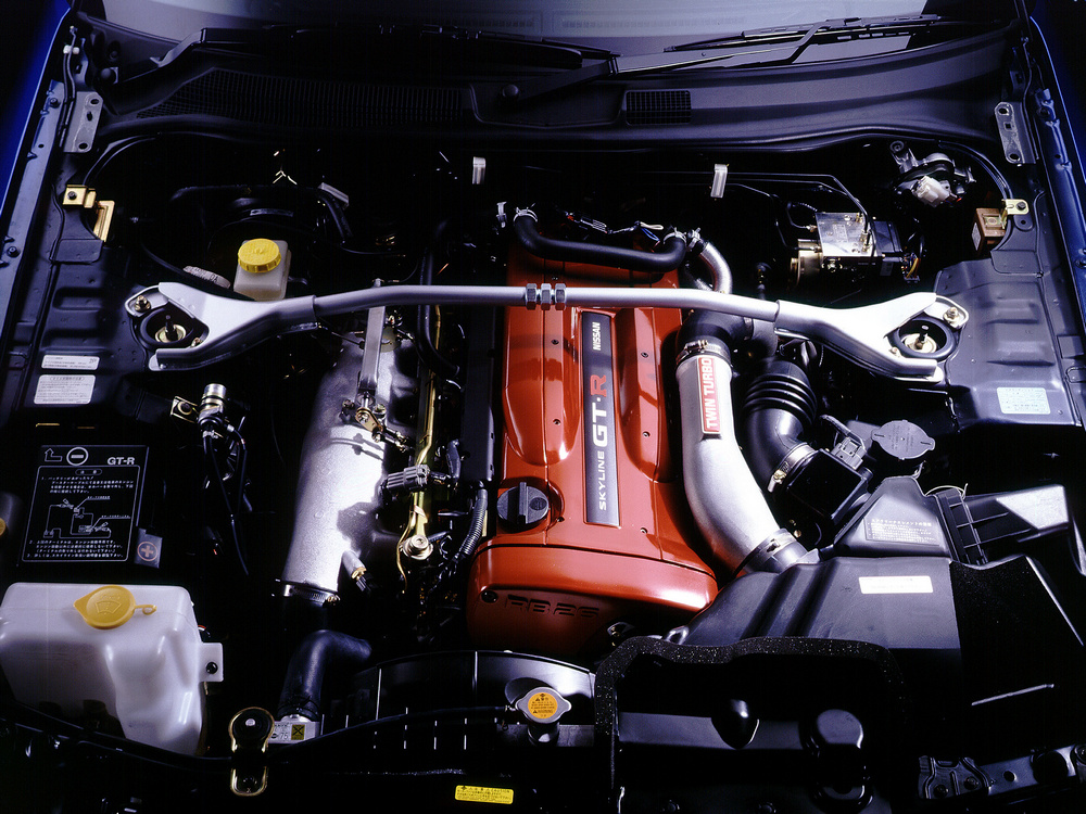 La GT-R des années 1990 était équipée d’un moteur 6 cylindres biturbo en ligne de 2,6 litres développant 206kW (280 PS ; 276ch). Les turbocompresseurs standard étaient de conception hybride acier/céramique, ce qui leur permettait de s’enrouler plus rapidement en raison de la nature légère de la roue d’échappement en céramique.