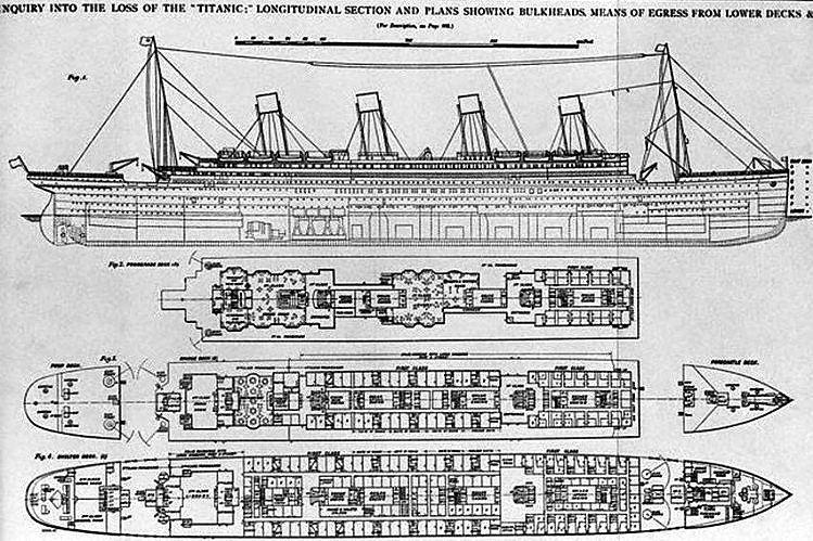 Les 10 ponts du Titanic permettent de l'élever au rang de plus grand paquebot jamais construit à son époque. 7 de ses ponts (les ponts abritant des cabines destinées aux passagers) sont désignés par des lettres, de A à G (A étant en haut et G en bas). Au-dessus du pont A se trouve le pont des embarcations (ou pont supérieur). Le pont des ballasts sert de base au navire, ainsi qu'aux salles des chaudières et des machines qui s'étendent jusqu'aux ponts Orlop et G. Ces 2 ponts comprennent également les cales et les réserves d'eau et de nourriture du navire.