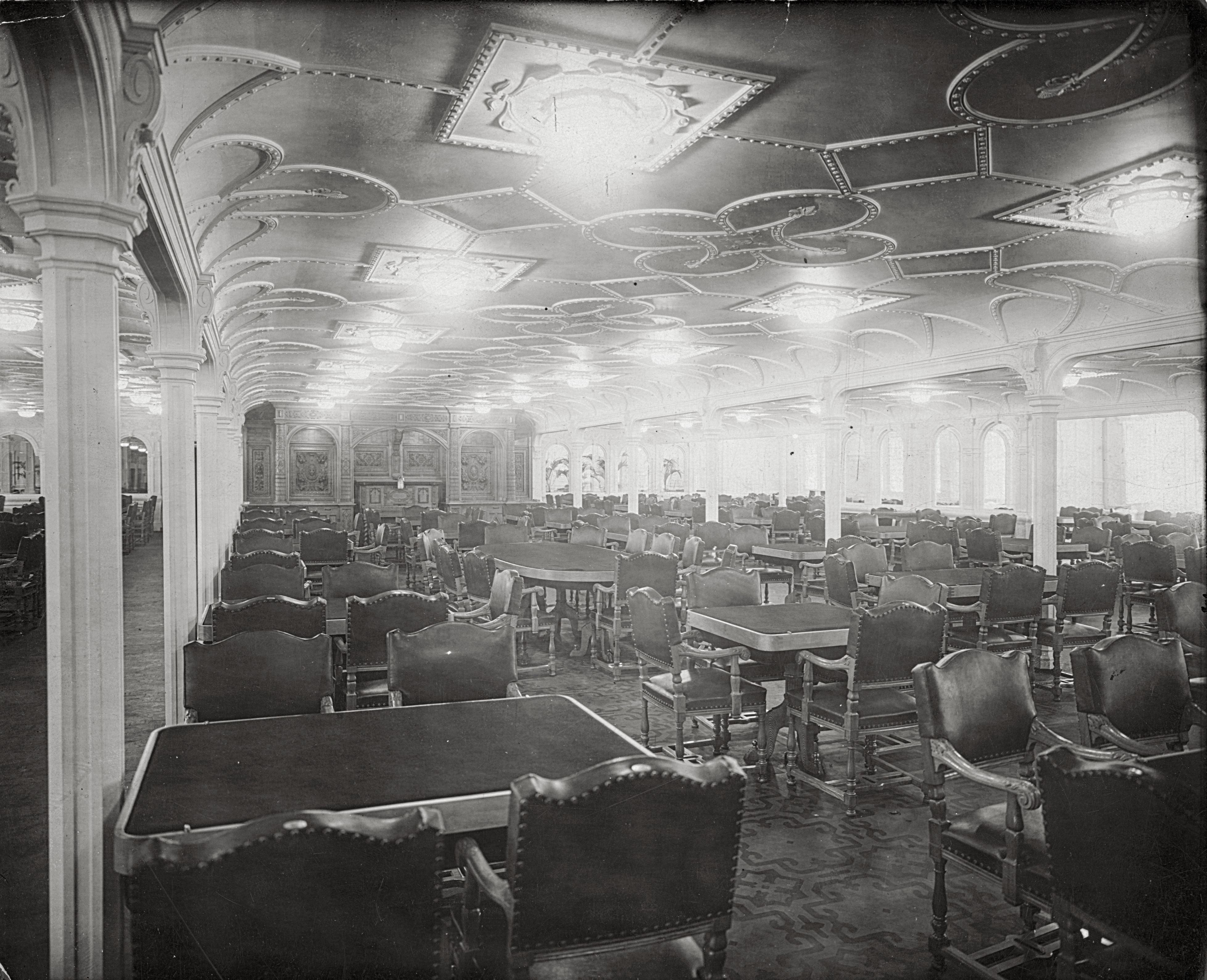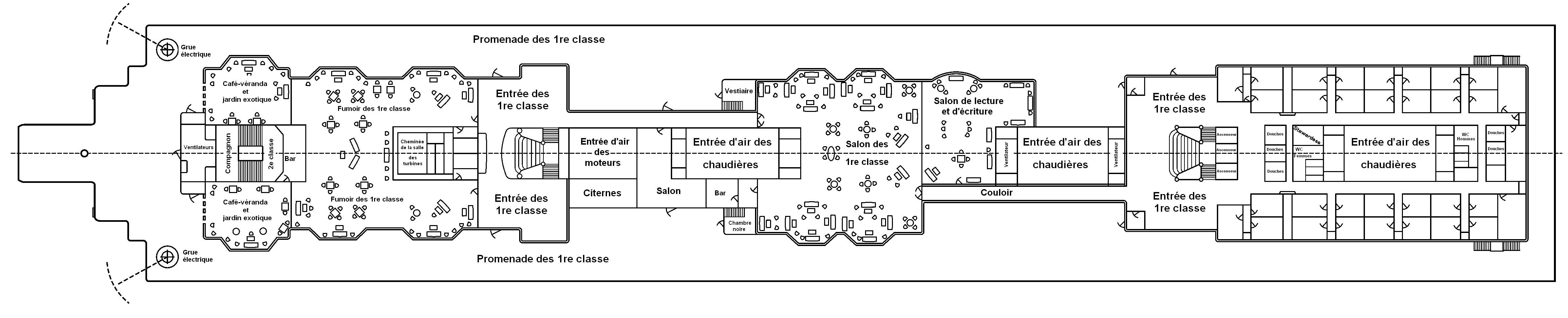 Le Titanic présente un luxe et un confort inégalés pour l'époque. Les installations de première classe s'étendent du pont des embarcations au pont E, et comprennent gymnase, fumoir, restaurant à la carte, café véranda, piscine, bains turcs et salon de lecture et de correspondance, ainsi qu'une promenade couverte. Certaines cabines sont équipées de salles de bains, et 2 d'entre elles disposent même d'une promenade privée. Toutes ces cabines et installations sont reliées par 2 somptueux escaliers, celui situé à l'avant étant associé à 3 ascenseurs desservant les ponts A à E. La vaste salle à manger de première classe se situe sur le pont D.