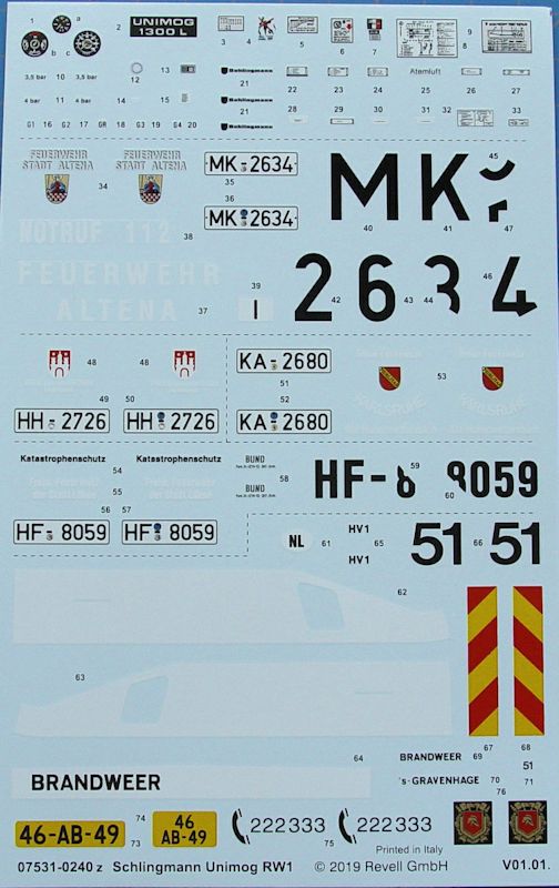 Instructions de montage & peinture : La notice a été couronnée de succès. Tout est très clairement coloré, sur 28 pages. Le montage est divisé en au moins 95 étapes. Ainsi, chaque section reste claire, vous ne pouvez pas oublier ou négliger les composants. La feuille de décalcomanie contient de nombreux panneaux d’entretien et d’information tels qu’ils peuvent être vus sur chaque brigade de pompiers. Très bien conçu !