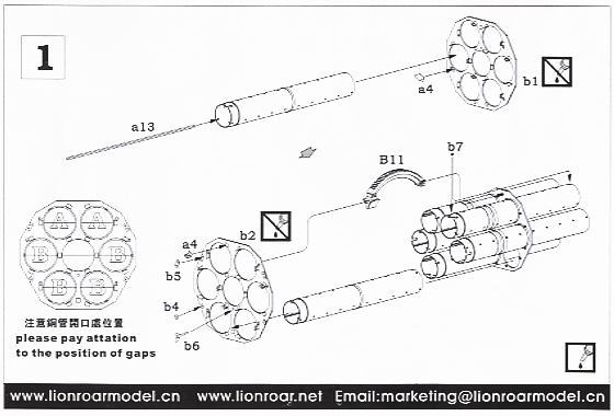 Lors du montage des barillets à travers les 2 plaques de montage, des précautions sont nécessaires car ils peuvent se tordre sur leur axe et vous devez vérifier l'alignement dans différentes directions pour vous assurer qu'ils sont uniformes, en plus du fait qu'il y a 5 petits rivets de fixation entre les extrémités des barillets pour les maintenir en place. De petits trous de positionnement sont inclus dans les tubes du canon pour ces rivets que vous devez également aligner correctement en même temps que le montage à travers les plaques de montage. La fine tige en plastique fournie est utilisée pour les 5 rivets afin que vous n'ayez pas à être trop précis lors de la coupe à la longueur car vous pouvez la couper plus tard.