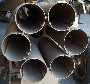 Le Nebelwerfer 41 était une pièce d'artillerie de lancement de roquettes avec six barils, chacun tirant un Wurfgranate 41 de 75 livres de 150 mm (grenade à roquette) à une portée d'environ 6800 mètres (environ 4,2 miles).