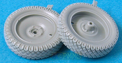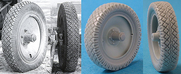 Les roues en résine ont des détails de jante très bien faits des 2 côtés et le dessin de la bande de roulement est également très bien défini et bien que ce ne soit pas le modèle de bande de roulement le plus courant vu sur de nombreuses photos de canons Nebelwerfers ou de 3,7cm PaK qui utilisent les mêmes roues, c'est l'un des divers types de bande de roulement utilisés.
