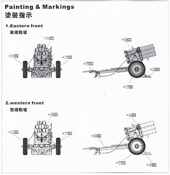 Il n'y a pas de marquage réel inclus seulement 2 options de peinture, 1 en gris foncé pour le front de l'Est et 1 en jaune foncé pour le front de l'Ouest, mais vous pouvez essentiellement peindre le modèle pour les scénarios de guerre précoces ou ultérieurs.